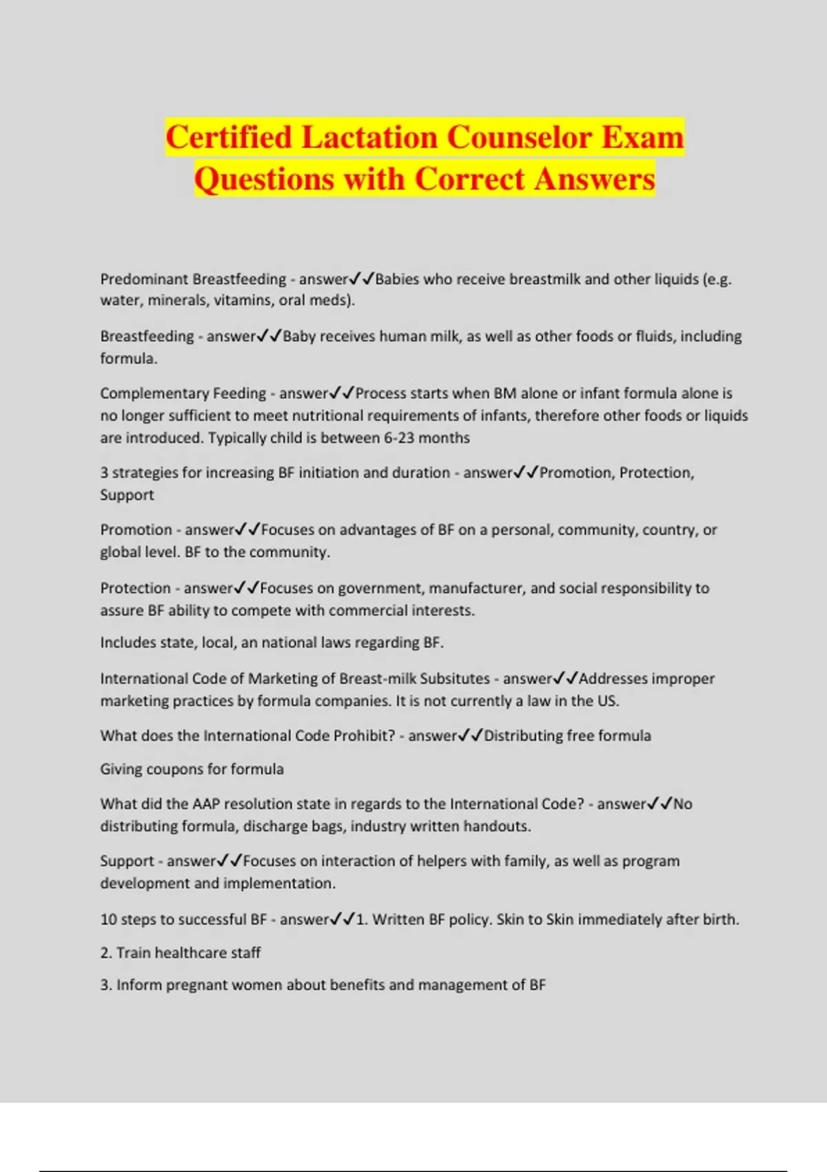 Certified Lactation Counselor Exam Questions with Correct Answers