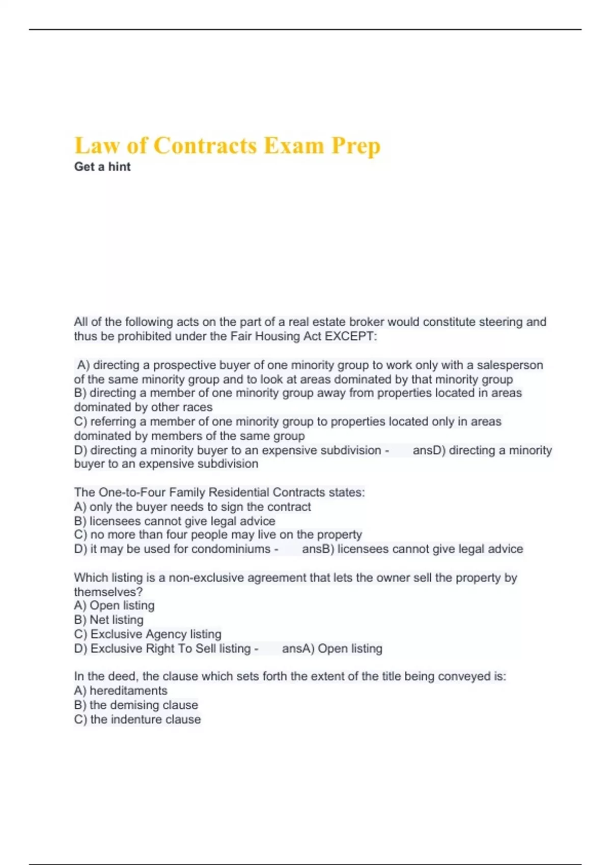 All of the following acts on the part of a real estate broker would constitute steering and thus be prohibited under the Fair Housing Act EXCEPT: A) directing a prospective buyer of one minority group to work only with a salesperson of the same minority group and to look at areas dominated by that minority group B) directing a member of one minority group away from properties located in areas dominated by other races C) referring a member of one minority group to properties located only in areas dominated by members of the same group D) directing a minority buyer to an expensive subdivision - ansD) directing a minority buyer to an expensive subdivision The One-to-Four Family Residential Contracts states: A) only the buyer needs to sign the contract B) licensees cannot give legal advice C) no more than four people may live on the property D) it may be used for condominiums - ansB) licensees cannot give legal advice Which listing is a non-exclusive agreement that lets the owner sell the property by themselves? A) Open listing B) Net listing C) Exclusive Agency listing D) Exclusive Right To Sell listing - ansA) Open listing In the deed, the clause which sets forth the extent of the title being conveyed is: A) hereditaments B) the demising clause C) the indenture clause