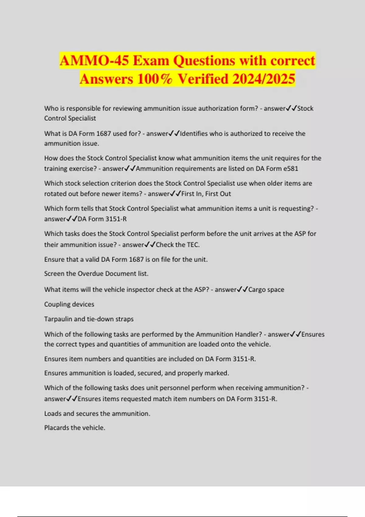 AMMO-45 Exam Questions with correct Answers 100% Verified 2024/2025 Who is responsible for reviewing ammunition issue authorization form? - answerStock Control Specialist What is DA Form 1687 used for? - answerIdentifies who is authorized to receive the ammunition issue. How does the Stock Control Specialist know what ammunition items the unit requires for the training exercise? - answerAmmunition requirements are listed on DA Form e581 Which stock selection criterion does the Stock Control Specialist use when older items are rotated out before newer items? - answerFirst In, First Out Which form tells that Stock Control Specialist what ammunition items a unit is requesting? - answerDA Form 3151-R Which tasks does the Stock Control Specialist perform before the unit arrives at the ASP for their ammunition issue? - answerCheck the TEC. Ensure that a valid DA Form 1687 is on file for the unit. Screen the Overdue Document list. What items will the vehicle inspector check at the ASP? - answerCargo space Coupling devices Tarpaulin and tie-down straps Which of the following tasks are performed by the Ammunition Handler? - answerEnsures the correct types and quantities of ammunition are loaded onto the vehicle. Ensures item numbers and quantities are included on DA Form 3151-R. Ensures ammunition is loaded, secured, and properly marked. Which of the following tasks does unit personnel perform when receiving ammunition? - answerEnsures items requested match item numbers on DA Form 3151-R. Loads and secures the ammuniti