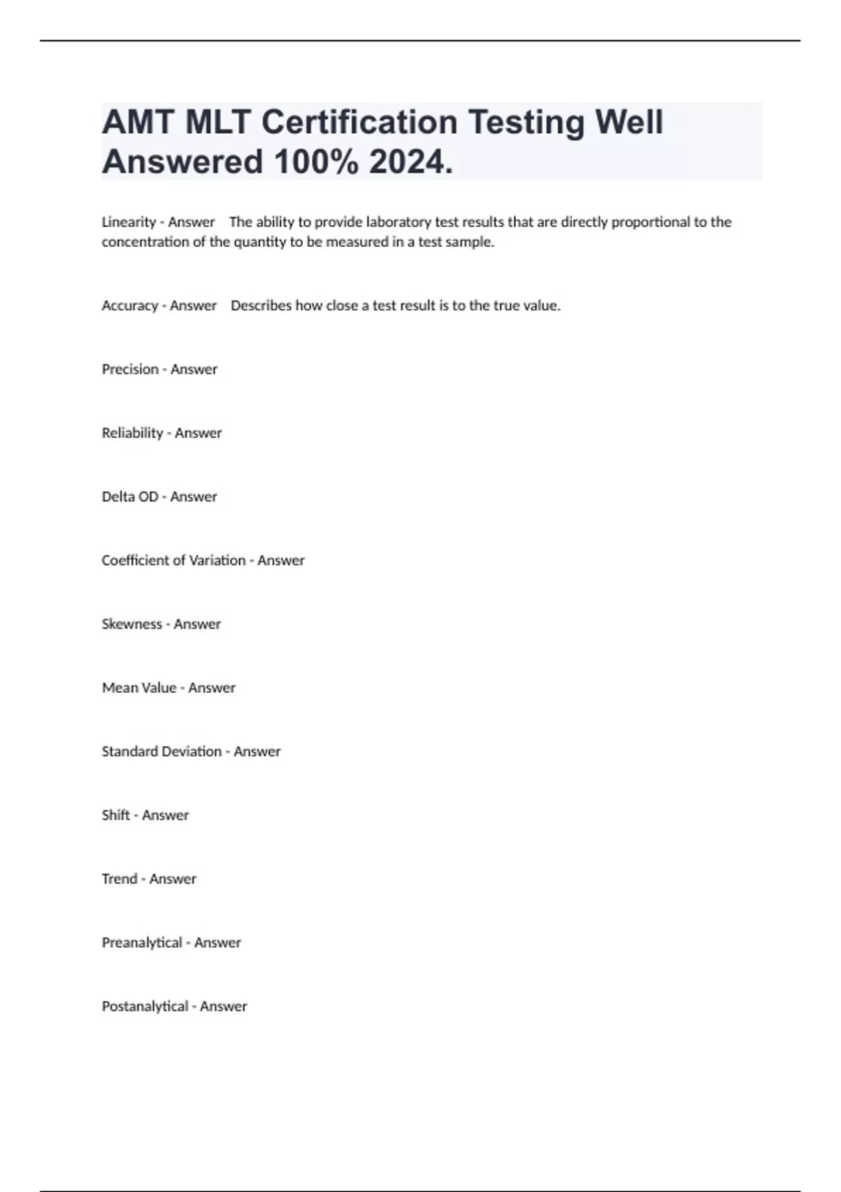 Linearity - Answer The ability to provide laboratory test results that are directly proportional to the concentration of the quantity to be measured in a test sample. Accuracy - Answer Describes how close a test result is to the true value. Precision - Answer Reliability - Answer Delta OD - Answer Coefficient of Variation - Answer Skewness - Answer Mean Value - Answer Standard Deviation - Answer Shift - Answer Trend - Answer Preanalytical - Answer Postanalytical - Answer