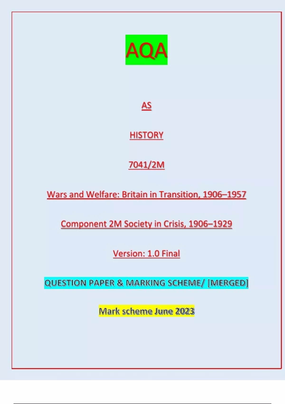 AQA AS HISTORY 7041/2M WARS AND WELFARE:BRITAIN IN TRANSITION , VERSION 1.0 FINAL QUESTION PAPERS & MERGED MARKING SCHEME | JUNE 2023