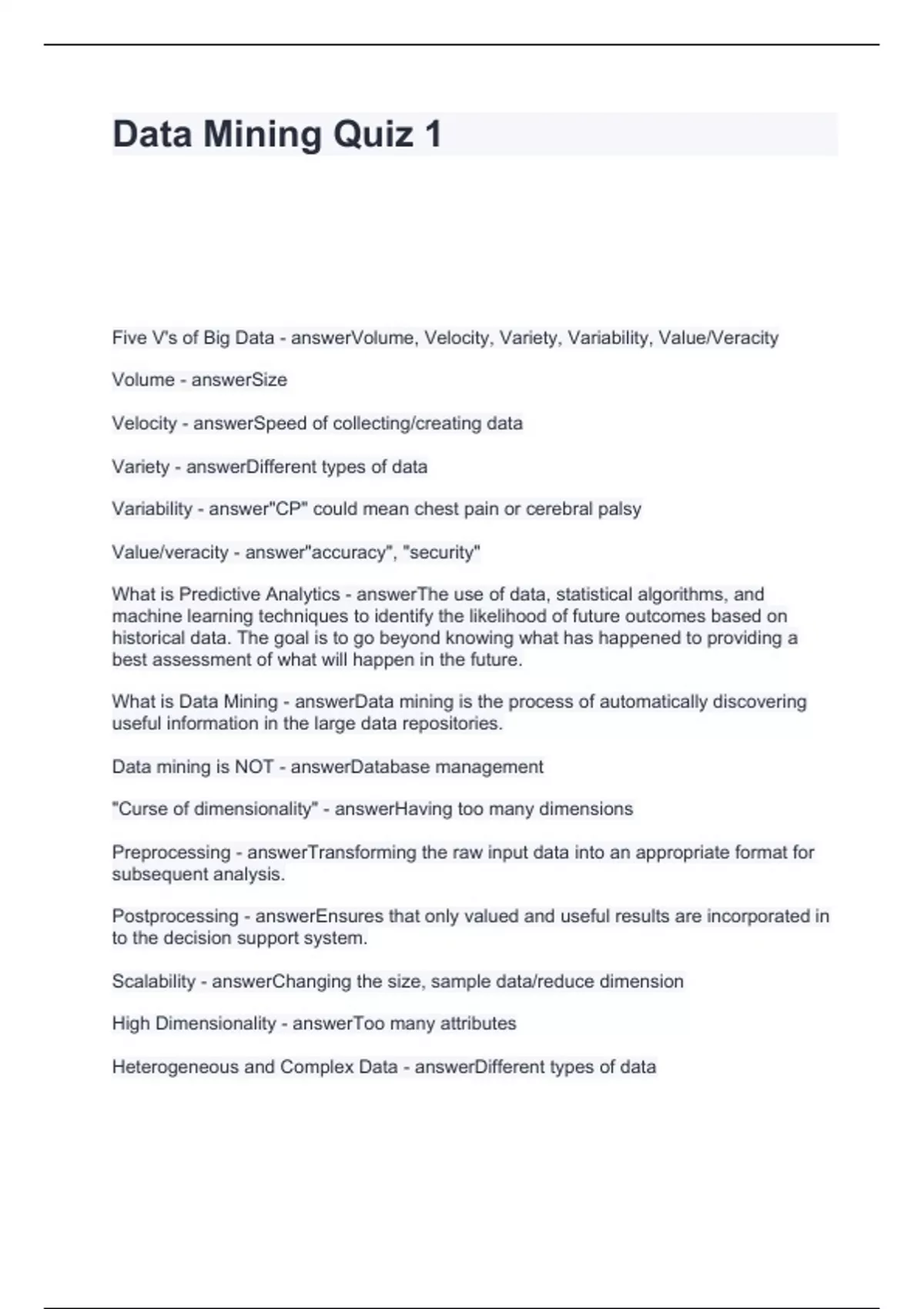 Data Mining Quiz 1 Questions and Answers 2024