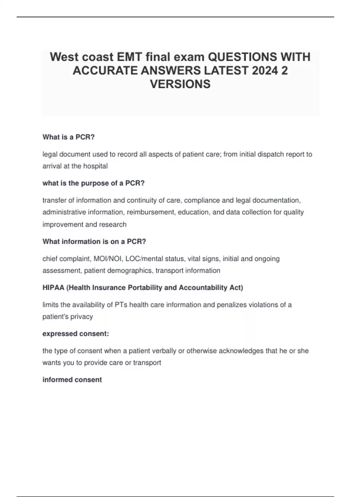 WEST COAST EMT FINAL EXAM TEST BANK ALL 40 CHAPTERS COMPLETE QUESTIONS AND ANSWERS