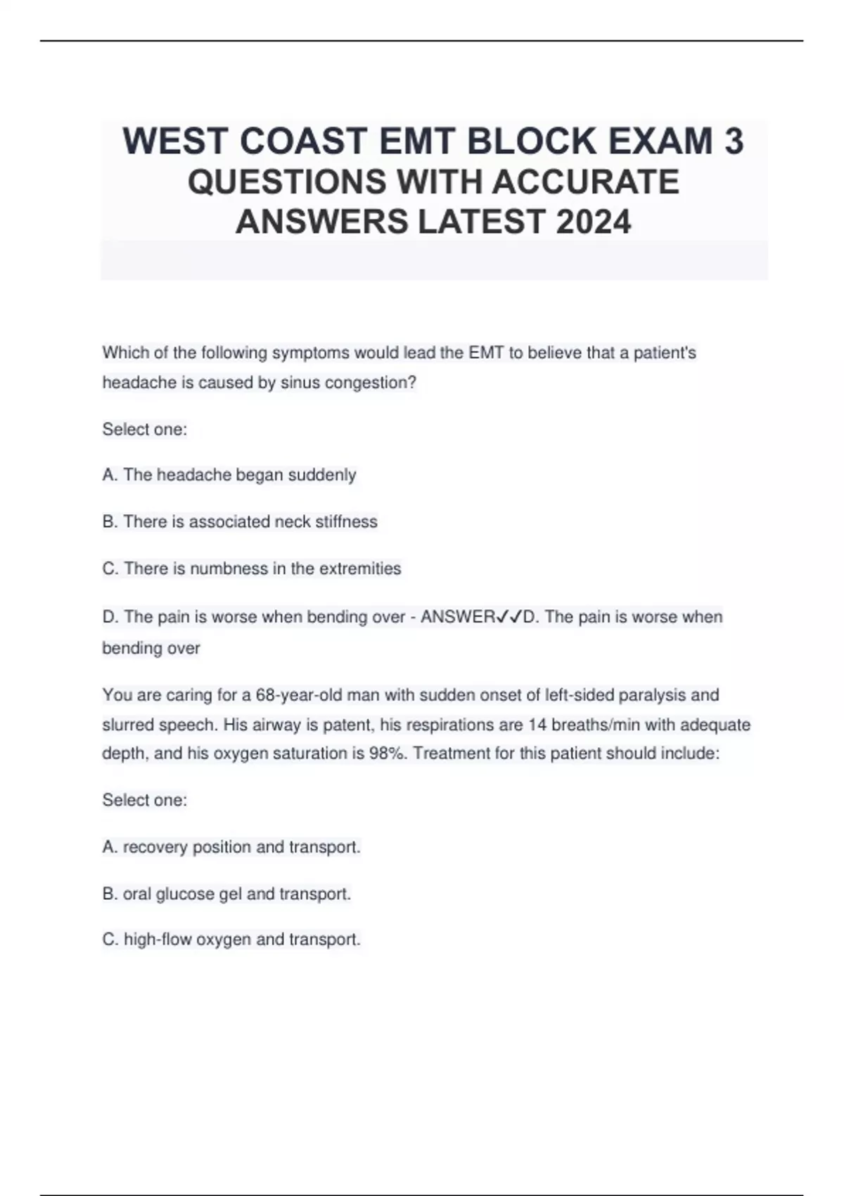 WEST COAST EMT BLOCK EXAM 3 QUESTIONS WITH ACCURATE ANSWERS LATEST 2024.