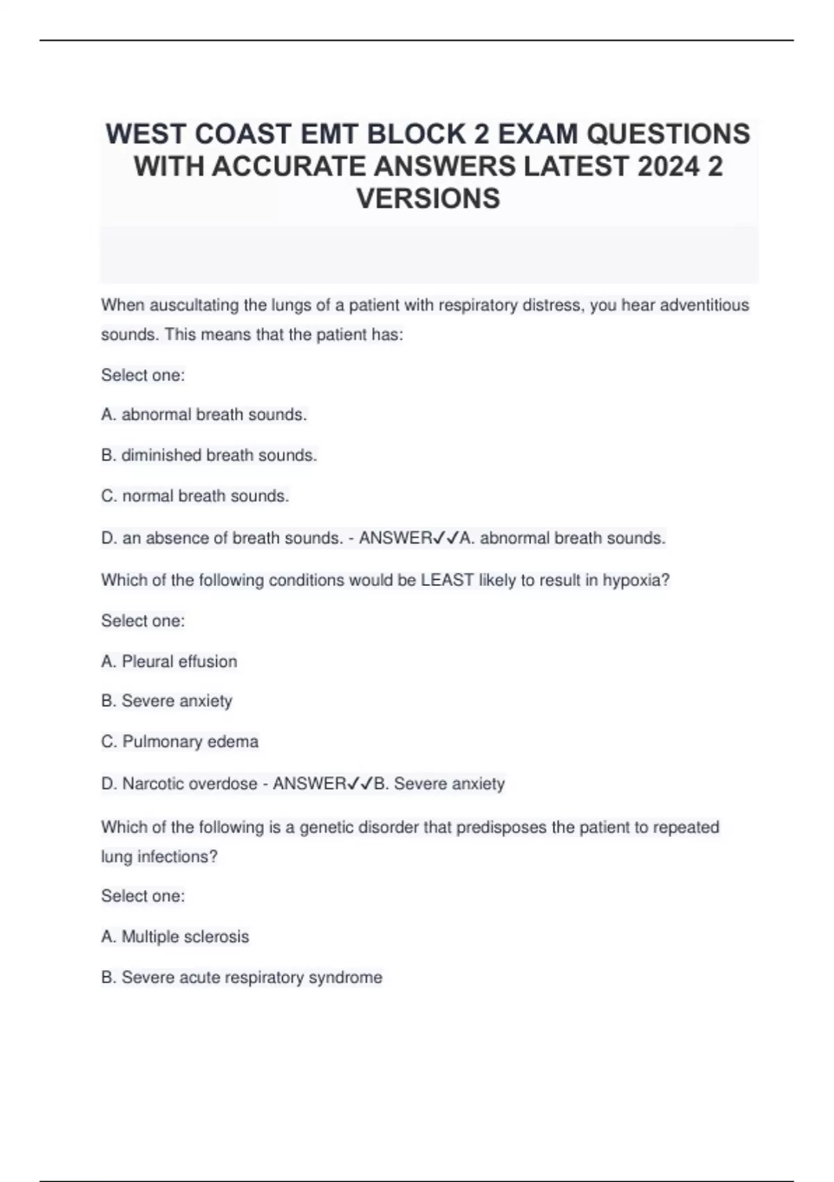 WEST COAST EMT BLOCK 2 EXAM QUESTIONS WITH ACCURATE ANSWERS LATEST 2024