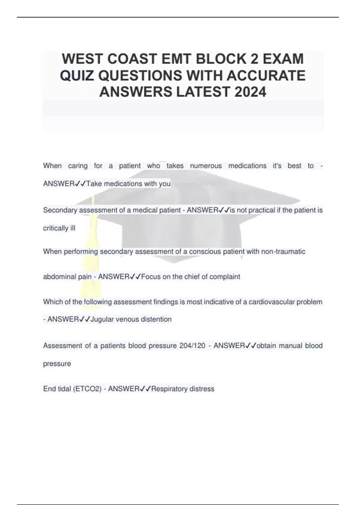 WEST COAST EMT BLOCK 2 EXAM QUIZ QUESTIONS WITH ACCURATE ANSWERS LATEST 2024.