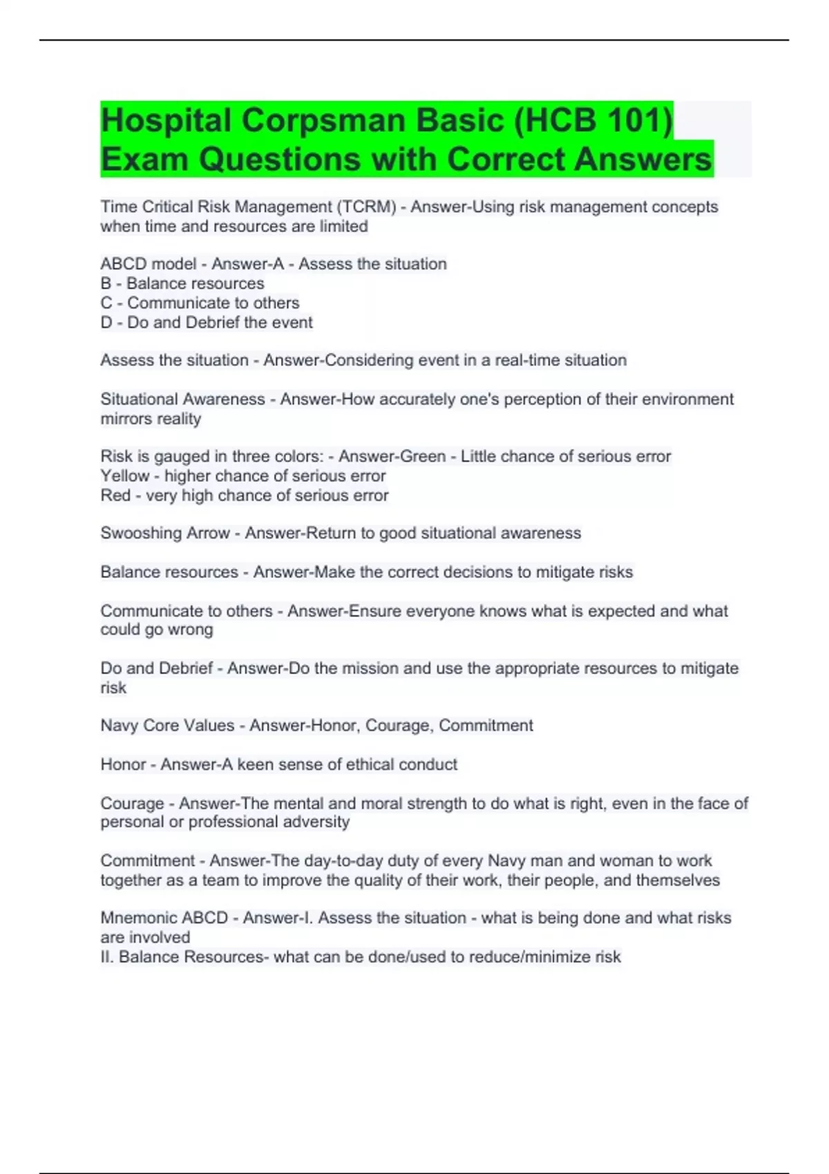 Hospital Corpsman Basic (HCB 101) Exam Questions with Correct Answers Communicate to others - Answer-Ensure everyone knows what is expected and what could go wrong Do and Debrief - Answer-Do the mission and use the appropriate resources to mitigate risk Navy Core Values - Answer-Honor, Courage, Commitment Honor - Answer-A keen sense of ethical conduct Courage - Answer-The mental and moral strength to do what is right, even in the face of personal or professional adversity Commitment - Answer-The day-to-day duty of every Navy man and woman to work together as a team to improve the quality of their work, their people, and themselves