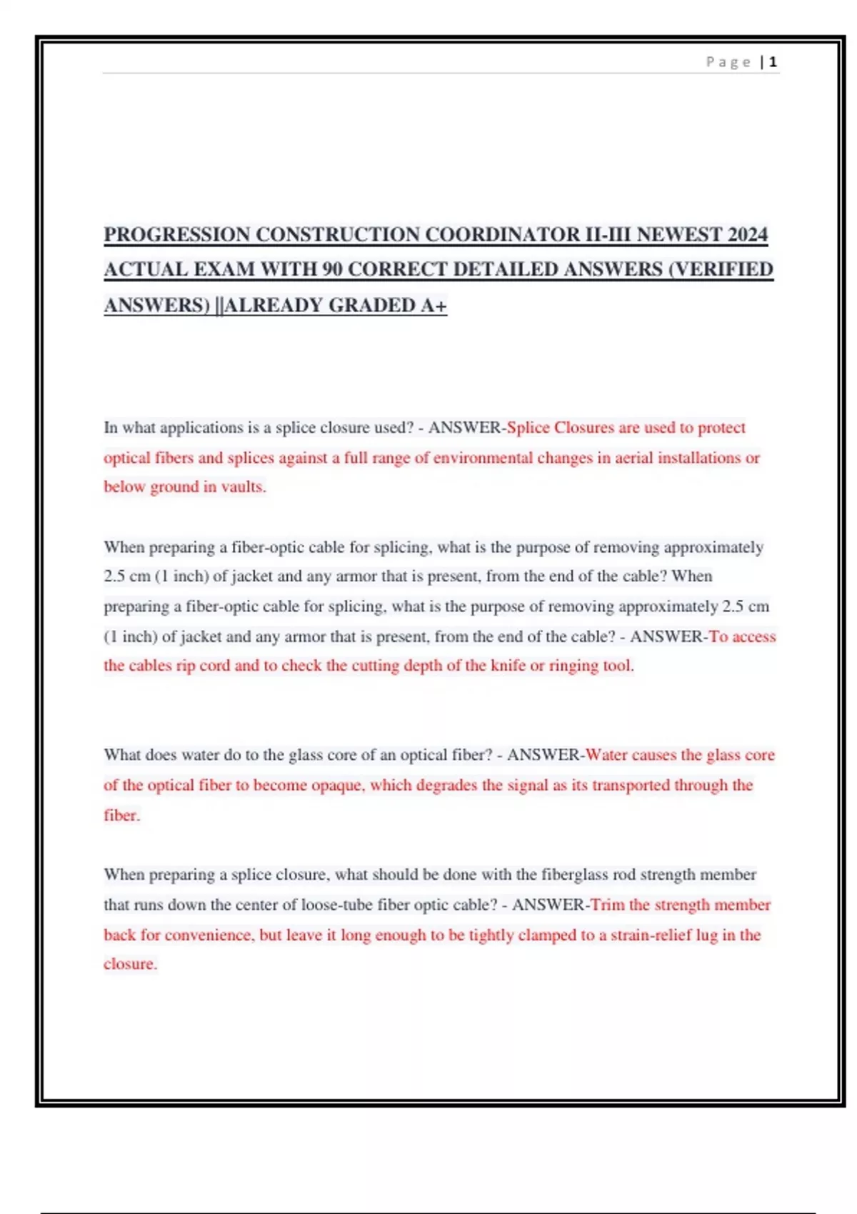 PROGRESION CONSTRUCTION COORDINATOR I-III NEWEST 2024 ACTUAL EXAM COMPLETE 100 QUESTIONS AND CORRECT DETAILED ANSWERS (VERIFIED ANSWERS) ALREADY GRADED A+ What is one reason why broadband cable operators install fiber-optic cable in stages instead of changing the infrastructure all at once? ANSWER- Changing the infrastructure all at once would cause too many service disruptions. What is the difference between the fiber-to-the-node (FTTN) and fiber-to-the-curb (FTTC) topologies? ANSWER- An FTTC is allowed a smaller number of RF amplifiers between the optical fiber and the customer premises.