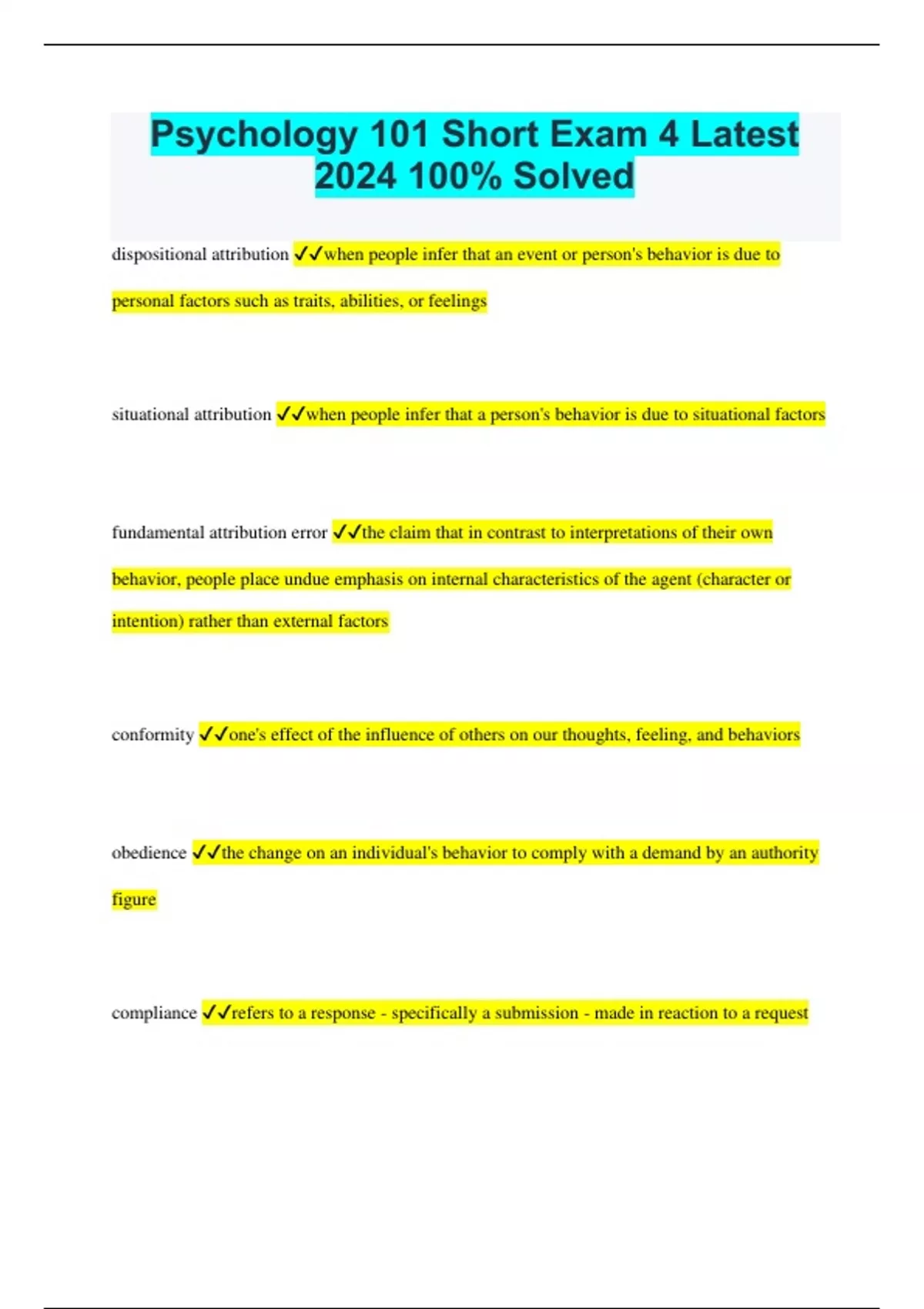 Psychology 101 Short Exam 4 Latest 2024 100% Solved
