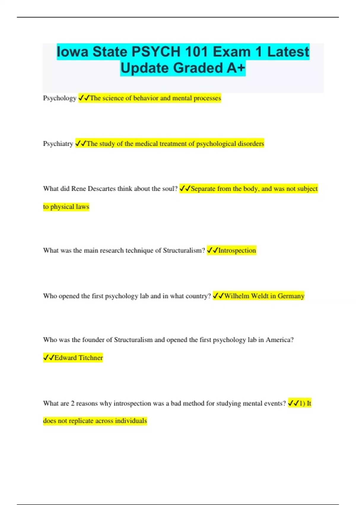 Iowa State PSYCH 101 Exam 1 Latest Update Graded A+ Psychology The science of behavior and mental processes Psychiatry The study of the medical treatment of psychological disorders What did Rene Descartes think about the soul? Separate from the body, and was not subject to physical laws What was the main research technique of Structuralism? Introspection Who opened the first psychology lab and in what country? Wilhelm Weldt in Germany Who was the founder of Structuralism and opened the first psychology lab in America? Edward Titchner What are 2 reasons why introspection was a bad method for studying mental events? 1) It does not replicate across individuals 2) Many psychological processes are not conscious How did Functionalists try to understand the mind? Determining its purpose Who was the founder of Functionalism and wrote the book "The Principles of Psychology"? William James What scientific theory influenced the Functionalists? Darwin's theory of evolution Psychoanalysis An approach to studying mental illness that assumes it is caused by subconscious conflicts What did Sigmund Freud think caused mental illnesses? Subconscious events Behaviorism Scientific study of the relationship between behavior and reinforcement Who was the founder of behaviorism who conditioned Little Albert? John Watson