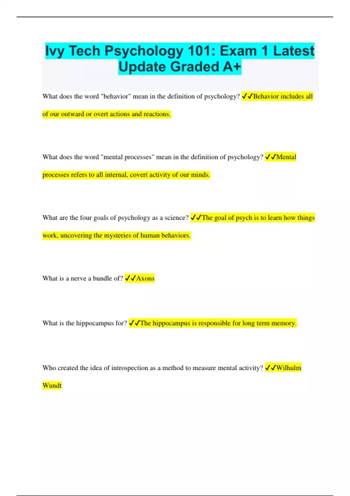 Ivy Tech Psychology 101: Exam 1 Latest Update Graded A+ What does the word "behavior" mean in the definition of psychology? Behavior includes all of our outward or overt actions and reactions. What does the word "mental processes" mean in the definition of psychology? Mental processes refers to all internal, covert activity of our minds. What are the four goals of psychology as a science? The goal of psych is to learn how things work, uncovering the mysteries of human behaviors. What is a nerve a bundle of? Axons What is the hippocampus for? The hippocampus is responsible for long term memory. Who created the idea of introspection as a method to measure mental activity? Wilhulm Wundt Which psychologist was most concerned about the study of adaptation to surroundings? Wlliam James What did Freud believe controlled most of our behavior? Our unconscious thoughts What perspective is the "third force?" Humanisitc Which perspective is most interested in self-actualization? Humanistic Which perspective is interested in storage and retrieval of information? Cognitive Which perspective is interested in how behavior relates to the survival of a species? Evolutionary What are the steps of the scientific method? 1. Perceiving Question 2. Hypothesis---> Educated guess 3. Testing 4. Conclusion 5. Report results What is the observer effect? When the person/animal being observed knows that they are being observed so the don't behave naturally. What kind of observers does a researcher use to overcome observer bias? Blind Observers What is a case study and what are the advantages and disadvantages to it? A case study is when one individual is studied in great detail. Advantage: Lots of detail and study is rare. Disadvantages: Can't apply research, could be bias. What is the difference between the experimental group and the control group? Experimental: the experiment is done to it. Control: the group that doesn't