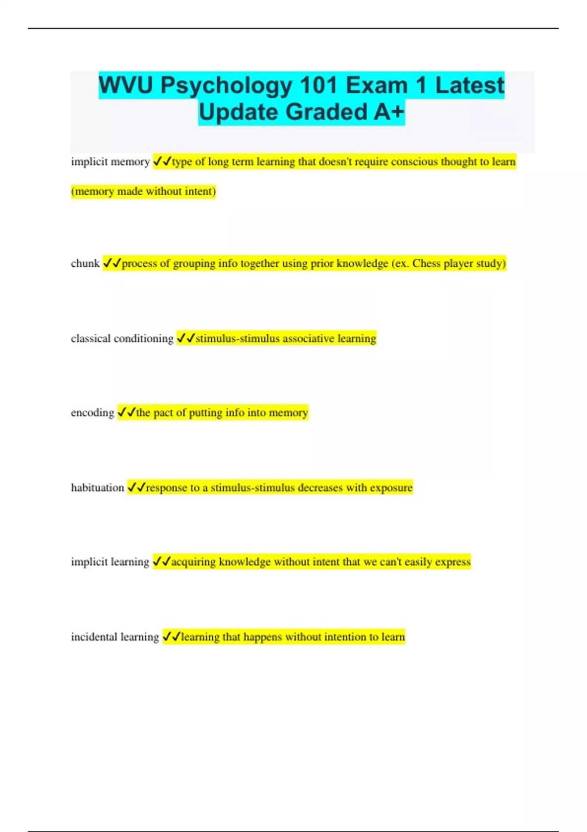 WVU Psychology 101 Exam 1 Latest Update Graded A+ implicit memory type of long term learning that doesn't require conscious thought to learn (memory made without intent) chunk process of grouping info together using prior knowledge (ex. Chess player study) classical conditioning stimulus-stimulus associative learning encoding the pact of putting info into memory habituation response to a stimulus-stimulus decreases with exposure implicit learning acquiring knowledge without intent that we can't easily express incidental learning learning that happens without intention to learn metacognition knowledge/skills and awareness people have of their own learning and memory nonassociative learning single repeated exposure leads to a change in behavior operant conditioning stimulus-response associative learning perceptual learning aspects of our perception changes as a result of experience Sensitization response to a stimulus increases with exposure transfer-appropriate processing memory performance is better when the test uses the same type of knowledge as the encoding activity working memory memory used to hold onto information temporarily (example: keeping your place in a multiplication problem) behaviorism study of behavior cognitive psychology the study of mental processes conciousness awareness of ourselves and our environment empiricism idea that knowledge comes from experience (promoted by John Locke and Thomas Reid eugenics process of selective breeding to promote desired traits flashbulb memory vivid and highly detailed memory of an emotionally significant event functionalism area of american psych that focused on the utility of conciousness (how we think) gestalt psych attempt to study the unity of experience introspection method of focusing on internal processes neural impulse enables neurons