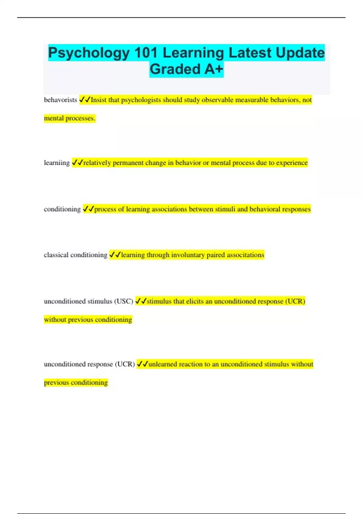 Psychology 101 Learning Latest Update Graded A+ behavorists Insist that psychologists should study observable measurable behaviors, not mental processes. learniing relatively permanent change in behavior or mental process due to experience conditioning process of learning associations between stimuli and behavioral responses classical conditioning learning through involuntary paired associtations unconditioned stimulus (USC) stimulus that elicits an unconditioned response (UCR) without previous conditioning unconditioned response (UCR) unlearned reaction to an unconditioned stimulus without previous conditioning neutral stimulus (NS) stimulus that, before conditioning, doesn't naturally bring about a response of interest conditioned stimulus (CS) previously neutral stimulus that, through repeated pairings with an unconditioned stimulus now causes a conditioned response conditioned response (CR) learned reaction to a conditioned stimulus occurring because of previous repeated pairings with an unconditioned stimulus 6 principles of classical conditioning acquisition, stimulus generalization, stimulus discrimination, extinctions, spontaneous recovery, higher order conditioning acquisition delayed conditioning (most effective) stimulus conditioning trace conditioning backward conditioning (least effective) delayed conditioning NS presented before UCS and remains until UCR begins tone presented before food stimulus conditioning NS presented at the same time as UCS tone and food presented simutaneously trace conditioning NS presented and then taken away, or ends before UCS presented tone sounds, but food presented only once the sound stops backward conditioning UCS presented before NS food presented before the tone