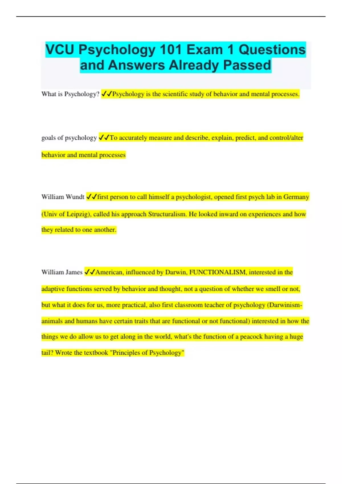 VCU Psychology 101 Exam 1 Questions and Answers Already Passed What is Psychology? Psychology is the scientific study of behavior and mental processes. goals of psychology To accurately measure and describe, explain, predict, and control/alter behavior and mental processes William Wundt first person to call himself a psychologist, opened first psych lab in Germany (Univ of Leipzig), called his approach Structuralism. He looked inward on experiences and how they related to one another. William James American, influenced by Darwin, FUNCTIONALISM, interested in the adaptive functions served by behavior and thought, not a question of whether we smell or not, but what it does for us, more practical, also first classroom teacher of psychology (Darwinism- animals and humans have certain traits that are functional or not functional) interested in how the things we do allow us to get along in the world, what's the function of a peacock having a huge tail? Wrote the textbook "Principles of Psychology" John Watson Championed psychology as the science of behavior and demonstrated conditioned responses on a baby, behaviorist (science rooted in observation) B.F. Skinner Behaviorist, he rejected introspection and studied how consequences shape behavior. Sigmund Freud emphasized the ways emotional responses to childhood experiences and our unconscious thought processes affect our behavior, thus psychology till the 1920's was defined as the "the science of mental life" Neuro-biological/Physiological behavioral and mental processes are ultimately explained by the activities of the nervous system, especially the brain, and the action of hormones, neurotransmitters and other chemicals psychodynamic how behavior springs from unconscious drives and conflicts Horney, Erikson, Freud (psychoanalytic) *behavior and mental processes are largely determined by unconscious mental and emotional conflicts. Usually put instincts or desires for sex, aggression, security, and power against environmental obstacles to fulfillment of those desires, Structuralism ; where introspection was used to explore the structural elements of the human mind. Was first formal school of psychology, begun by Willhelm Wundt Functionalism which focused on how our mental and behavioral processes function-how they enable us to adapt, survive, and flourish. Begun by American philosopher William James. Behaviorism science should be an objective science and studies behavior without reference to mental processes. Neurobiological/Physiological Behavior and mental processes are ultimately explained by the activities of the nervous system, especially the brain, and the action of hormones, neurotransmitters, and other chemicals. Psychodynamic Freud and followers. Behavior and mental processes are largely determined by unconscious mental and emotional conflicts. Behavioral Psychology can be studied scientifically by examining the overt behavior of humans and animals. Behavior is largely shaped by the patterns & punishments that each person has experienced in his/her environment Cognitive Behavior is determined by how information is encoded, stored, retrieved, or otherwise processed by the brain Humanistic historically significant perspective that emphasized the growth potential of healthy people and the individual's potential for personal growth. Humans make choices by thinking, rather than by simple influence from the environment biopsychosocial model the integrated viewpoint that incorporates various levels of analysis and offers a more complete picture of any given
