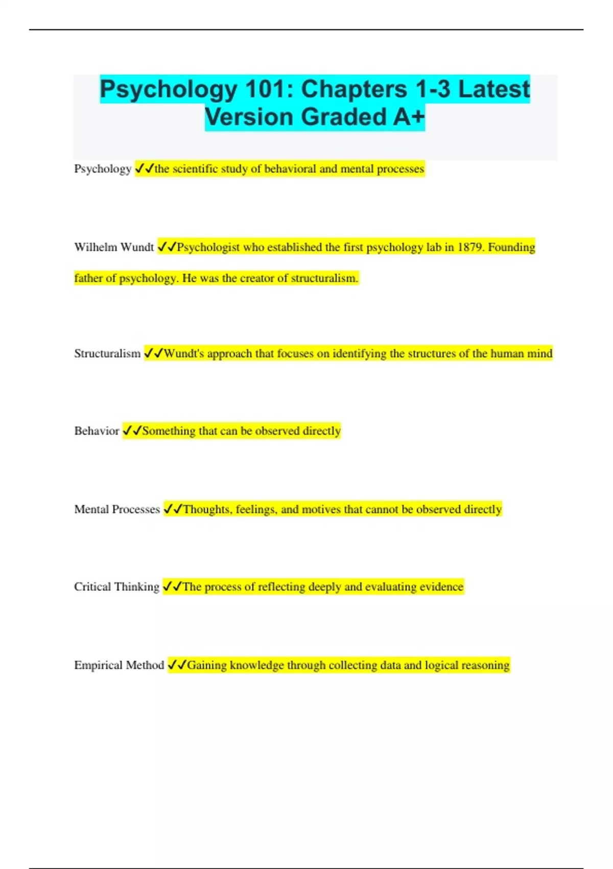 Psychology 101: Chapters 1-3 Latest Version Graded A+ Psychology the scientific study of behavioral and mental processes Wilhelm Wundt Psychologist who established the first psychology lab in 1879. Founding father of psychology. He was the creator of structuralism. Structuralism Wundt's approach that focuses on identifying the structures of the human mind Behavior Something that can be observed directly Mental Processes Thoughts, feelings, and motives that cannot be observed directly Critical Thinking The process of reflecting deeply and evaluating evidence Empirical Method Gaining knowledge through collecting data and logical reasoning Positive Psychology Branch of psychology that emphasizes human strengths William James A well-known psychologist who developed an approach known as functionalism Functionalism James's approach that emphasizes the functions and purposes of the mind and behavior Natural Selection Darwin's theory that only the most fit and well-adapted animals survive and pass on their traits Biological Approach A focus on the body, especially the brain and the nervous system Neuroscience Study of the function, structure, genetics, and development of the nervous system Behavioral Approach Study of observable behavioral responses and their environmental determinants Psychodynamic Approach Study of the conflict between biological drives, society's demands, and early childhood experiences Sigmund Freud The most well-known psychologist and the creator of the psychodynamic approach. He was know for being very dark and twisted Humanistic Approach Emphasizes a person's positive qualities and their capacity for personal growth Cognitive Approach Study of mental processes involved in knowing: perceive, remember, think Evolutionary Approach Study of evolutionary ideas such as adaptation, reproduction, and natural selection