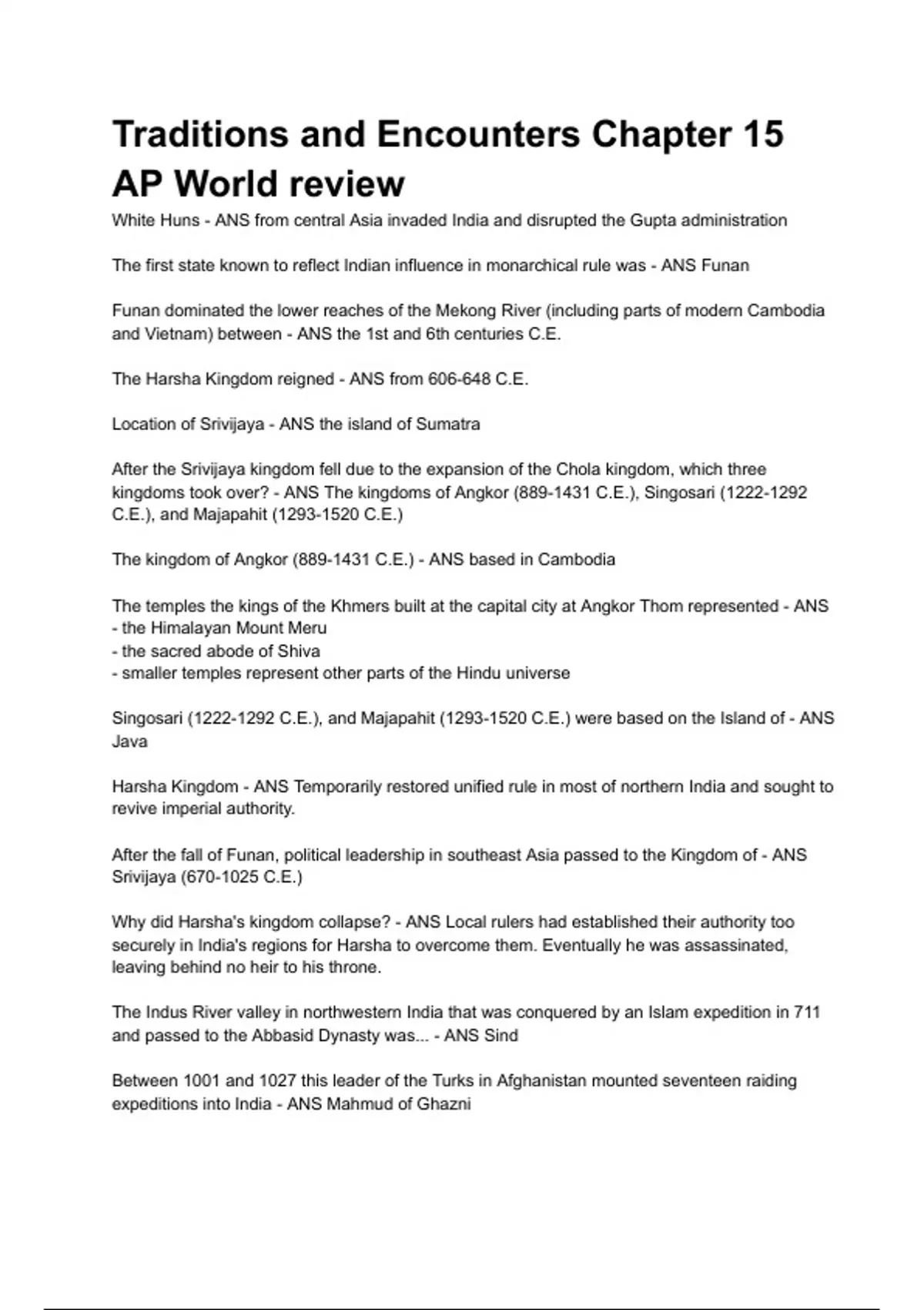 Traditions and Encounters Chapter 15 AP World review White Huns - ANS from central Asia invaded India and disrupted the Gupta administration The first state known to reflect Indian influence in monarchical rule was - ANS Funan Funan dominated the lower reaches of the Mekong River (including parts of modern Cambodia and Vietnam) between - ANS the 1st and 6th centuries C.E. The Harsha Kingdom reigned - ANS from 606-648 C.E. Location of Srivijaya - ANS the island of Sumatra After the Srivijaya kingdom fell due to the expansion of the Chola kingdom, which three kingdoms took over? - ANS The kingdoms of Angkor (889-1431 C.E.), Singosari ( C.E.), and Majapahit ( C.E.) The kingdom of Angkor (889-1431 C.E.) - ANS based in Cambodia The temples the kings of the Khmers built at the capital city at Angkor Thom represented - ANS - the Himalayan Mount Meru - the sacred abode of Shiva - smaller temples represent other parts of the Hindu universe Singosari ( C.E.), and Majapahit ( C.E.) were based on the Island of - ANS Java Harsha Kingdom - ANS Temporarily restored unified rule in most of northern India and sought to revive imperial authority. After the fall of Funan, political leadership in southeast Asia passed to the Kingdom of - ANS Srivijaya (670-1025 C.E.) Why did Harsha's kingdom collapse? - ANS Local rulers had established their authority too securely in India's regions for Harsha to overcome them. Eventually he was assassinated, leaving behind no heir to his throne. The Indus River valley in northwestern India that was conq