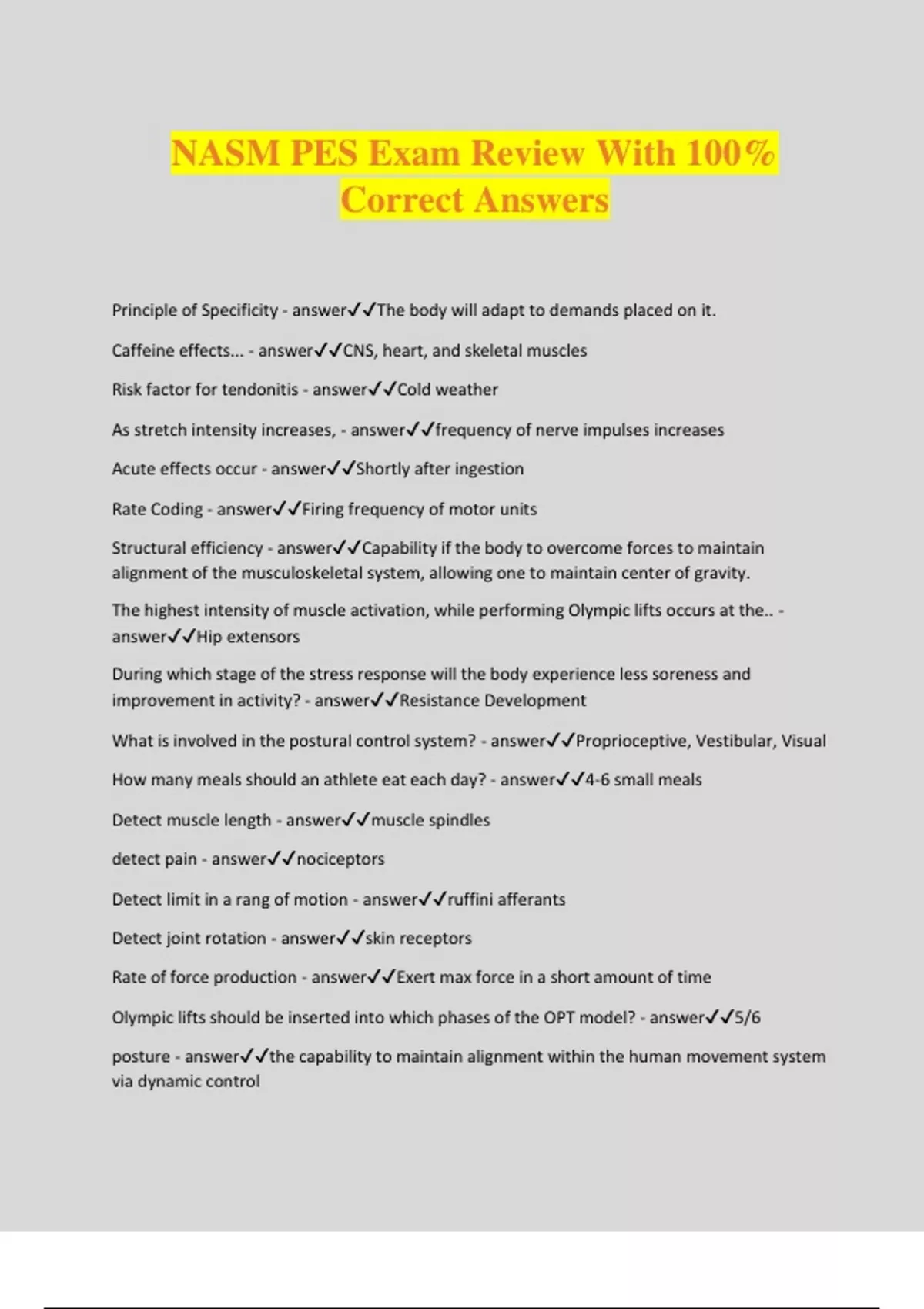NASM PES Exam Review With 100% Correct Answers Principle of Specificity - answerThe body will adapt to demands placed on it. Caffeine effects... - answerCNS, heart, and skeletal muscles Risk factor for tendonitis - answerCold weather As stretch intensity increases, - answerfrequency of nerve impulses increases Acute effects occur - answerShortly after ingestion Rate Coding - answerFiring frequency of motor units Structural efficiency - answerCapability if the body to overcome forces to maintain alignment of the musculoskeletal system, allowing one to maintain center of gravity. The highest intensity of muscle activation, while performing Olympic lifts occurs at the.. - answerHip extensors During which stage of the stress response will the body experience less soreness and improvement in activity? - answerResistance Development What is involved in the postural control system? - answerProprioceptive, Vestibular, Visual How many meals should an athlete eat each day? - answer4-6 small meals Detect muscle length - answermuscle spindles detect pain - answernociceptors Detect limit in a rang of motion - answerruffini afferants Detect joint rotation - answerskin receptors Rate of force production - answerExert max force in a short amount of time Olympic lifts should be inserted into which phases of the OPT model? - answer5/6 posture - answerthe capability to maintain alignment within the human movement system via dynamic control Main reason cardiac output is improved with training - answerincrease in stroke volume What will improve rate of force production - answerplyometrics: rapid exchange between eccentric and concentric contractions power exercises Olympic lifts occur in what planes - answerfrontal and saggital The majority of strength gains occur within - answerthe first 12 weeks As intensity of exercise increases, - answerrespiratory quotient increases The number of foot contacts measures - answertraining volume speed is - answerrate of performance As intensity increases, the number of repetitions that can be performed - answerdecreases Preferred location to take pulse - answerradial pulse measures horizontal speed - answer5-0-5 Measures reaction capabilities in multiple planes - answerT-test Predicts VO2 Max - answer20-m shuttle test Measures lateral speed - answerPro lane agility drill Synergistic dominance - answerstabilizing muscles compensating for weak primary movers strength - answerAbility to exert force against resistance Stretch shortening cycle - answereccentric contraction followed quickly by a contraction Flexibility - answeroptimum range of motion to enhance functional capabilities Elastic potential energy is stored - answerin the eccentric phase Vitamin C in athletes will - answerReduce Muscle soreness Waste of aerobic ATP production is - answerCarbon Dioxide and water Functional unit of a muscle - answerSarcomere Vegetarians should supplement which vitamin? - answerb12 which form of stretching results in the greatest increase in range of motion - answerproprioceptive neuromuscular facilitati