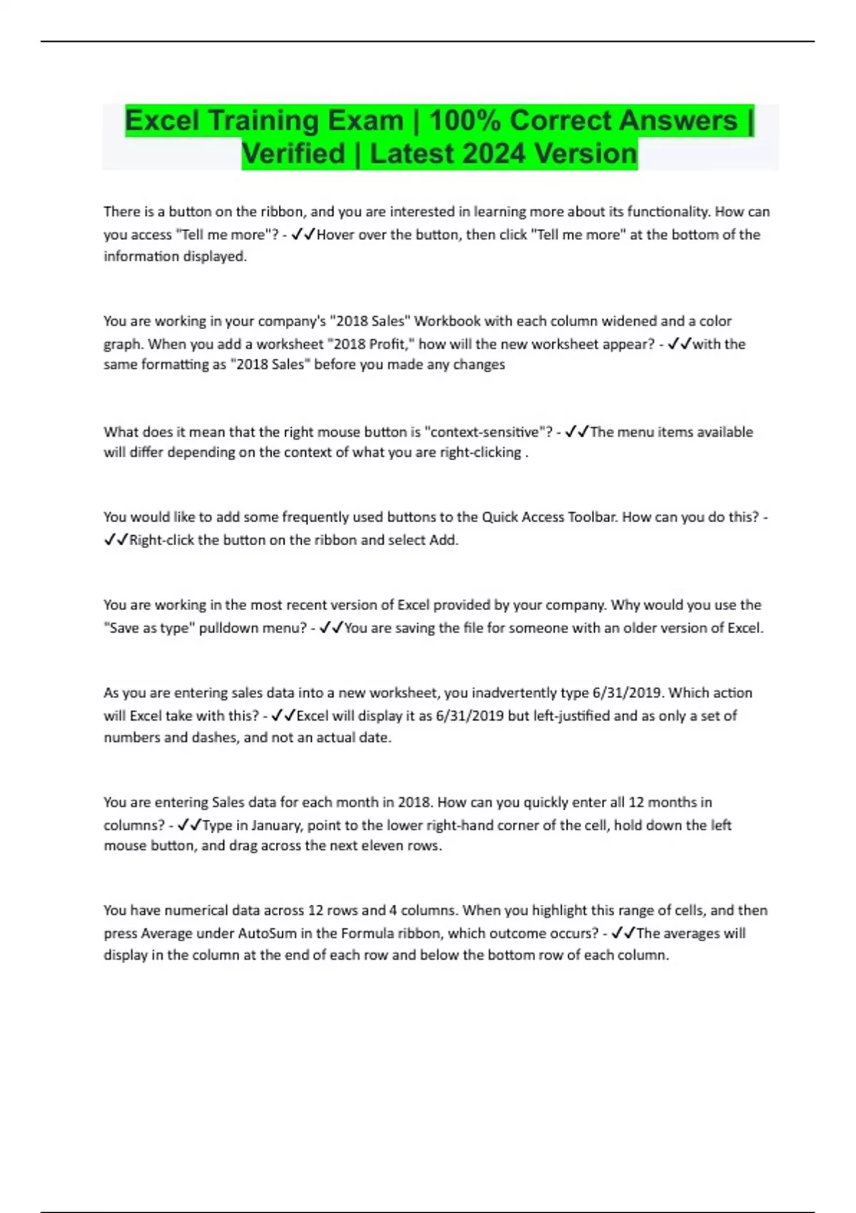 Excel Training Exam | 100% Correct Answers | Verified | Latest 2024 Version