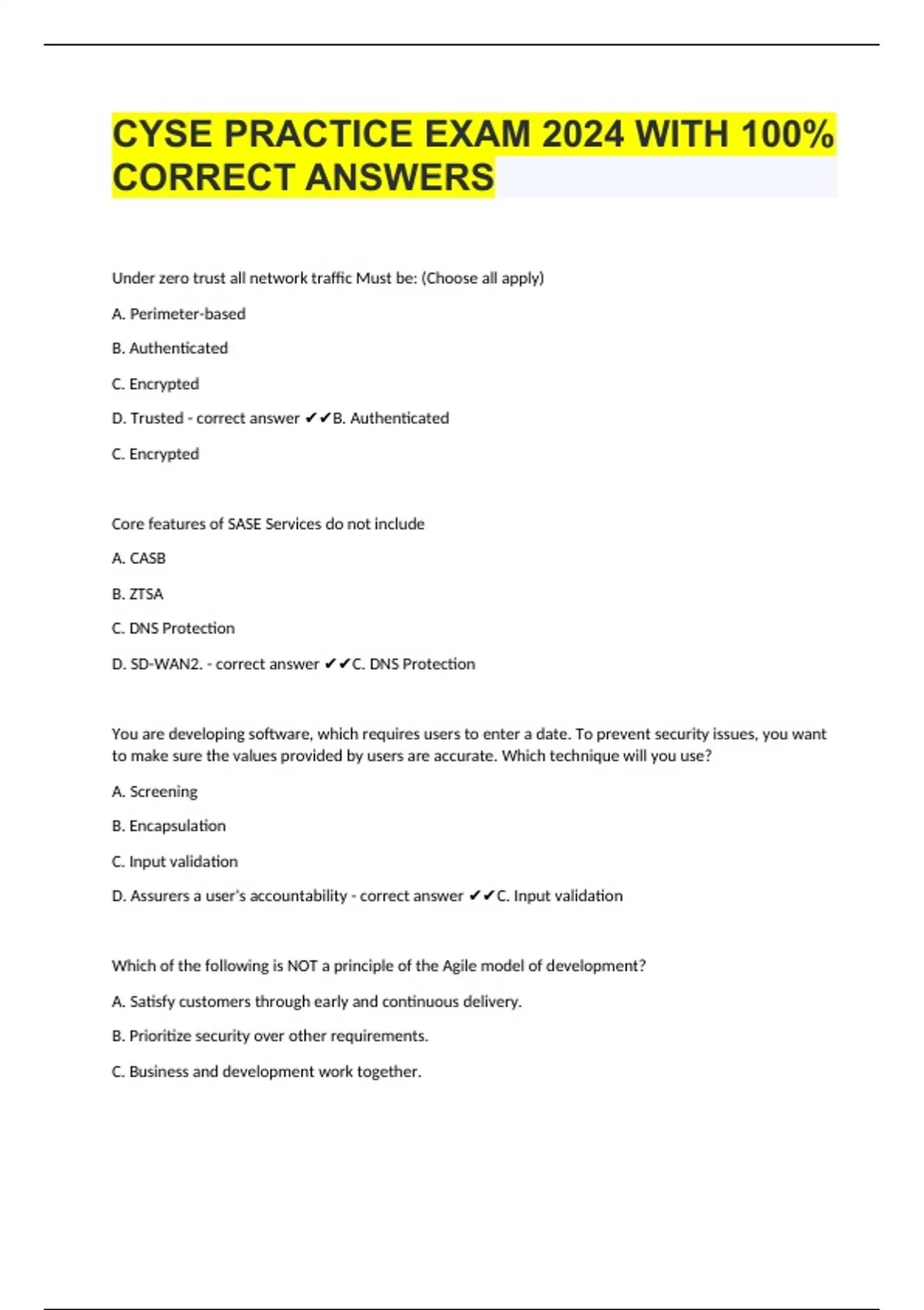 Under zero trust all network traffic Must be: (Choose all apply) A. Perimeter-based B. Authenticated C. Encrypted D. Trusted - correct answer B. Authenticated C. Encrypted Core features of SASE Services do not include A. CASB B. ZTSA C. DNS Protection D. SD-WAN2. - correct answer C. DNS Protection You are developing software, which requires users to enter a date. To prevent security issues, you want to make sure the values provided by users are accurate. Which technique will you use? A. Screening B. Encapsulation C. Input validation D. Assurers a user's accountability - correct answer C. Input validation Which of the following is NOT a principle of the Agile model of development? A. Satisfy customers through early and continuous delivery. B. Prioritize security over other requirements. C. Business and development work together. D. Pay continuous attention to technical excellence - correct answer B. Prioritize security over other requirements. Which of the following key is used to enforce referential integrity between database tables? A. Primary key B. Foreign key C. Super key D. Candidate key - correct answer B. Foreign key SaaS providers manage and secure all the following except: A. Infrastructure B. OS C. Application Stacks D. Ac