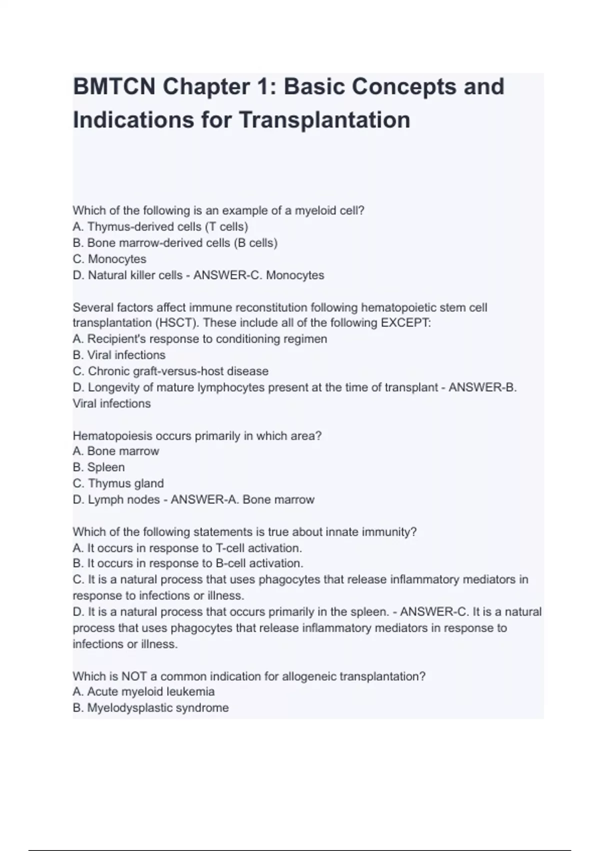 BMTCN Chapter 1: Basic Concepts and Indications for Transplantation questions with correct answers