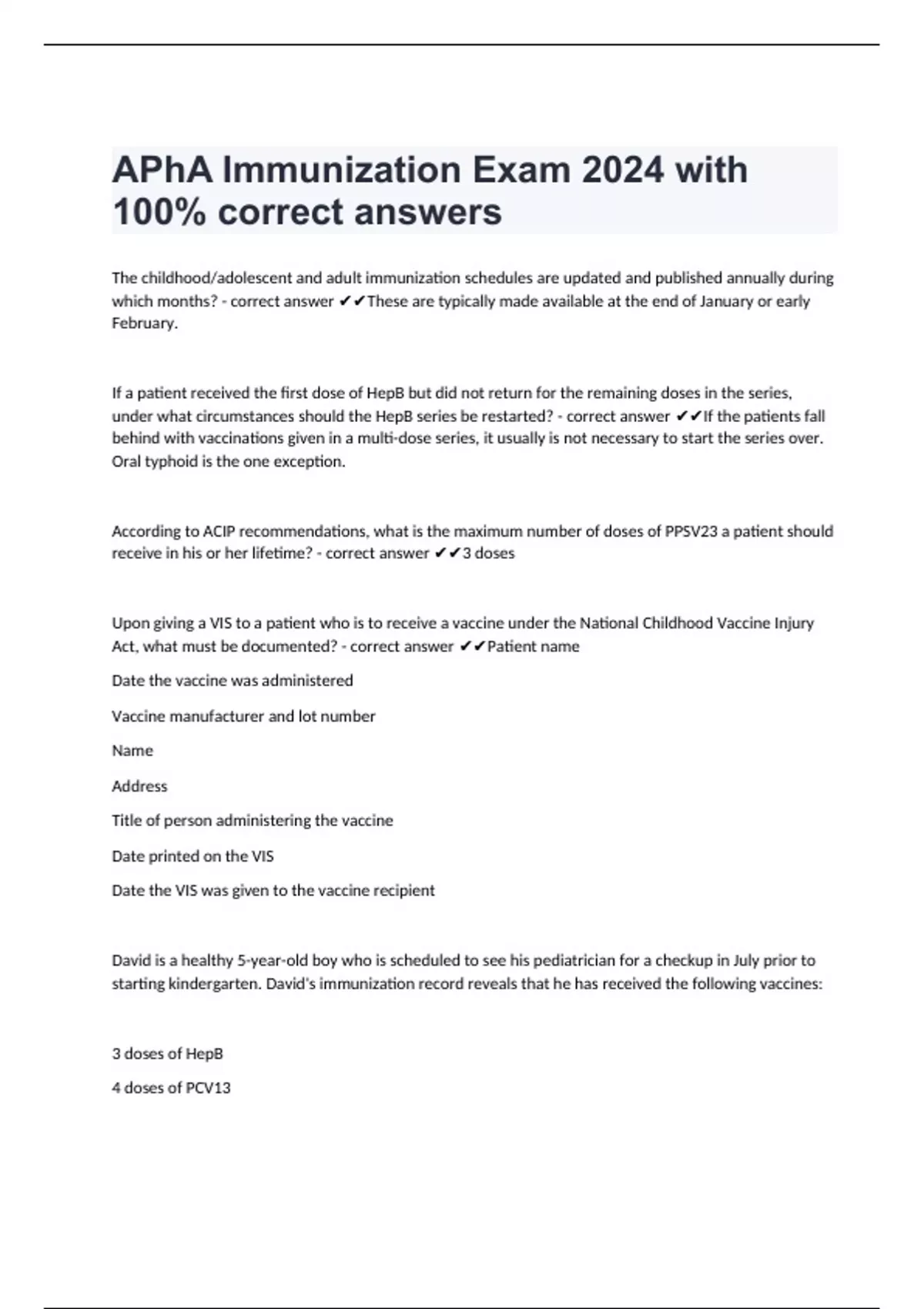 The childhood/adolescent and adult immunization schedules are updated and published annually during which months? - correct answer These are typically made available at the end of January or early February. If a patient received the first dose of HepB but did not return for the remaining doses in the series, under what circumstances should the HepB series be restarted? - correct answer If the patients fall behind with vaccinations given in a multi-dose series, it usually is not necessary to start the series over. Oral typhoid is the one exception. According to ACIP recommendations, what is the maximum number of doses of PPSV23 a patient should receive in his or her lifetime? - correct answer 3 doses Upon giving a VIS to a patient who is to receive a vaccine under the National Childhood Vaccine Injury Act, what must be documented? - correct answer Patient name Date the vaccine was administered Vaccine manufacturer and lot number Name Address Title of person administering the vaccine Date printed on the VIS Date the VIS was given to the vaccine recipient David is a healthy 5-year-old boy who is scheduled to see his pediatrician for a checkup in July prior to starting kindergarten. David's immunization record reveals that he has received the following vaccines: 3 doses of HepB 4 doses of P