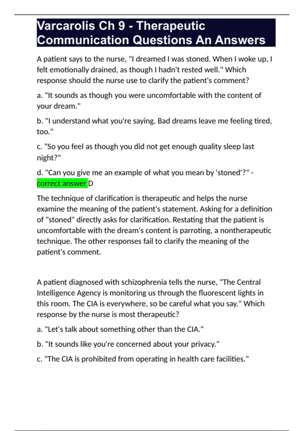 Varcarolis Ch 9 - Therapeutic Communication Questions An Answers