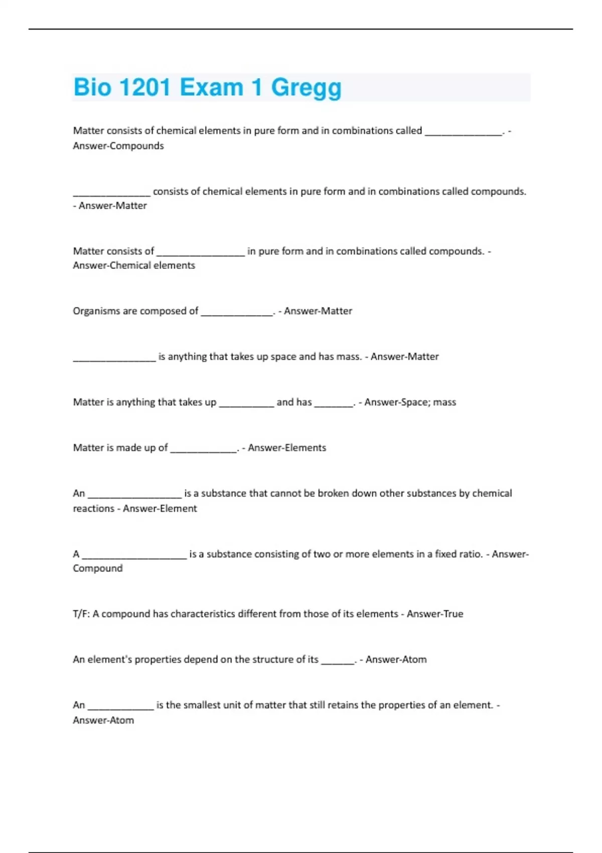 Matter consists of chemical elements in pure form and in combinations called ______________. - Answer-Compounds ______________ consists of chemical elements in pure form and in combinations called compounds. - Answer-Matter Matter consists of ________________ in pure form and in combinations called compounds. - Answer-Chemical elements Organisms are composed of _____________. - Answer-Matter _______________ is anything that takes up space and has mass. - Answer-Matter Matter is anything that takes up __________ and has _______. - Answer-Space; mass Matter is made up of ____________. - Answer-Elements An _________________ is a substance that cannot be broken down other substances by chemical reactions - Answer-Element A ___________________ is a substance consisting of two or more elements in a fixed ratio. - AnswerCompound T/F: A compound has characteristics different from those of its elements - Answer-True An element's properties depend on the structure of its ______. - Answer-Atom An ____________ is the smallest unit of matter that still retains the properties of an element. - Answer-AtomAtoms can be broken down into smaller particles like ___________ (no charge), ______________ have a positive charge, and _____________ (negative). - Answer-Neutrons, protons, and electrons No electrical charge - Answer-Neutron Postive charge - Answer-Proton Negative charge - Answer-Electron