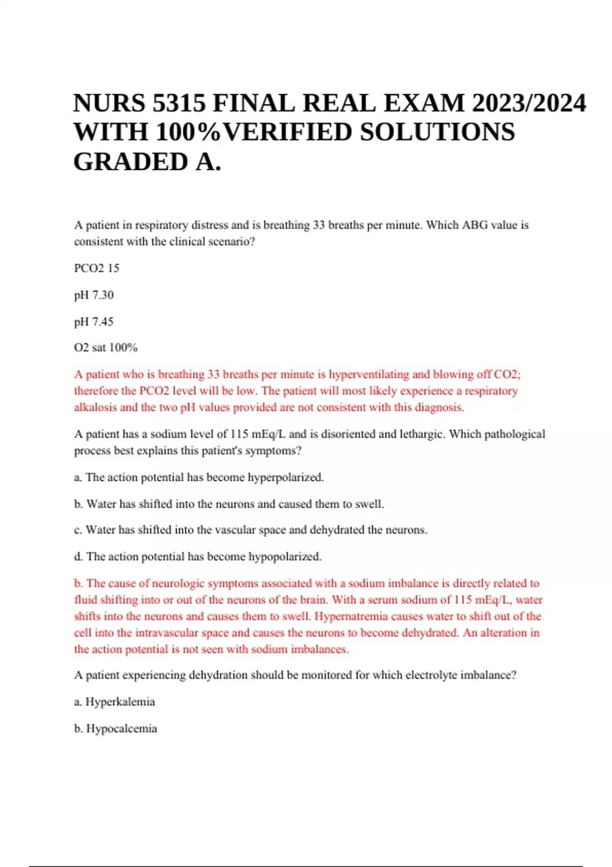 NURS 5315 FINAL REAL EXAM 2023/2024 WITH 100%VERIFIED SOLUTIONS GRADED A. A patient in respiratory distress and is breathing 33 breaths per minute. Which ABG value is consistent with the clinical scenario? PCO2 15 pH 7.30 pH 7.45 O2 sat 100% A patient who is breathing 33 breaths per minute is hyperventilating and blowing off CO2; therefore the PCO2 level will be low. The patient will most likely experience a respiratory alkalosis and the two pH values provided are not consistent with this diagnosis. A patient has a sodium level of 115 mEq/L and is disoriented and lethargic. Which pathological process best explains this patient's symptoms? a. The action potential has become hyperpolarized. b. Water has shifted into the neurons and caused them to swell. c. Water has shifted into the vascular space and dehydrated the neurons. d. The action potential has become hypopolarized. b. The cause of neurologic symptoms associated with a sodium imbalance is directly related to fluid shifting into or out of the neurons of the brain. With a serum sodium of 115 mEq/L, water shifts into the neurons and causes them to swell. Hypernatremia causes water to shift out of the cell into the intravascular space and causes the neurons to become dehydrated. An alteration in the action potential is not seen with sodium imbalances. A patient experiencing dehydration should be monitored for which electrolyte imbalance? a. Hyperkalemia b. Hypocalcemia NURS 5315 FINAL REAL EXAM 2023/2024 WITH 100%VERIFIED SOLUTIONS GRADED A. c. Hypercalcemia d. Hyponatermia a. Serum osmolality is increased during times of dehydration. An elevated serum osmolality will pull potassium into the intravascular space from the intracellular space and cause a rise in serum potassium. A married couple presents to your office for genetic counseling. The husband has an autosomal recessive disease and his wife has a heterozygous genotype for the disease. They ask you, What is the chance that our baby will have the disease? Which of the following answers is correct? 25% 50% 75% 100% A chromosome is a package of material located inside the cell nucleus which is made of proteins and a single molecule of DNA. There are 23 pairs of chromosomes in each human cell for a total of 46 chromosomes. Chromosomes are separated into two identical sets during mitosis or meiosis. This provides a set of chromosomes to each daughter cell which results from cell division. This process is responsible for the transfer of genetic information to the daughter cells. The first 22 pairs of chromosomes are known as autosomes. The 23rd pair of chromosomes is the pair which contains the genetic information for gender. This pair contains the genetic information which delineates between the male and female genders. Females have two X chromosomes (XX) and males have an XY chromosome pair. Autosomal chromosomes are said to be autologous. This means they do not carry genetic information pertaining to gender. Autosomal genetic diseases are carried on the first 22 pairs of chromosomes. Sex-linked diseases are only carried on the 23rd pair of chromosomes. The autosomal chromosomes are nearly identical to one another and are considered homologous to one another. Each autosomal chromosome in a pair carries identical genes. These two genes are known as alleles. The alleles occupy the same site on each partner of the chromosome pair and code for the same genetic trait or physiologic function. Alleles can be dominant or recessive. One allele may be dominant and the other recessive, or they both may be dominant or both recessive. The dominant alleles’ genetic code will always manifest in the individual’s phenotype. The information in the recessive allele is typically not expressed in the phenotype unless both alleles are recessive. For the purpose of clarity in use, the dominant gene is assigned a capital letter and the recessive gene is assigned a lower case letter. Any letter is okay to use but make sure you use the same letter for the genotype – for example, “Bb or aa.” The term homozygous refers to a pair of alleles which are either both dominant or recessive. For example, “BB or bb” are said to be homozygous because the alleles are either both dominant or recessive. An allele pair in which one is dominant and one is recessive is said to be heterozygous. In autosomal recessive disorders both alleles on the chromosome are affected by the genetic aberration. If only one recessive gene is affected by the genetic aberration then the person is said to be a carrier and will not have the phenotypic expression of the disease. The healthy, recessive allele will compensate for the allele which is affected by the genetic aberration. The carrier can pass the trait but does not have the genetic disease. In an autosomal dominant disorder the dominant gene is the only gene that has to be affected by the genetic aberration in order to have the phenotypic expression of the disease. A healthy recessive allele cannot compensate for a diseased dominant allele. In order to answer this question one must understand the above information and draw a Punnett Square. The husband has an autosomal recessive disease which means his genotype must be aa. The wife has a heterozygous genotype for the disease which means her genotype is Aa. The capital A reflects a healthy gene so she is merely a carrier and does not express the disease phenotype. The father’s genotype is written across the top line and the mother’s genotype is written in the boxes to the left. The four boxes in the middle are the possible genotypes of their offspring. Each box represents a 25% chance for the offspring to have that particular genotype. The question asks you to determine the chances the offspring will have the autosomal recessive disease or in other words, express the phenotype for the disease. The genotype which will result in the disease is “aa.” Therefore, there is a 50% chance that their offspring will have the a