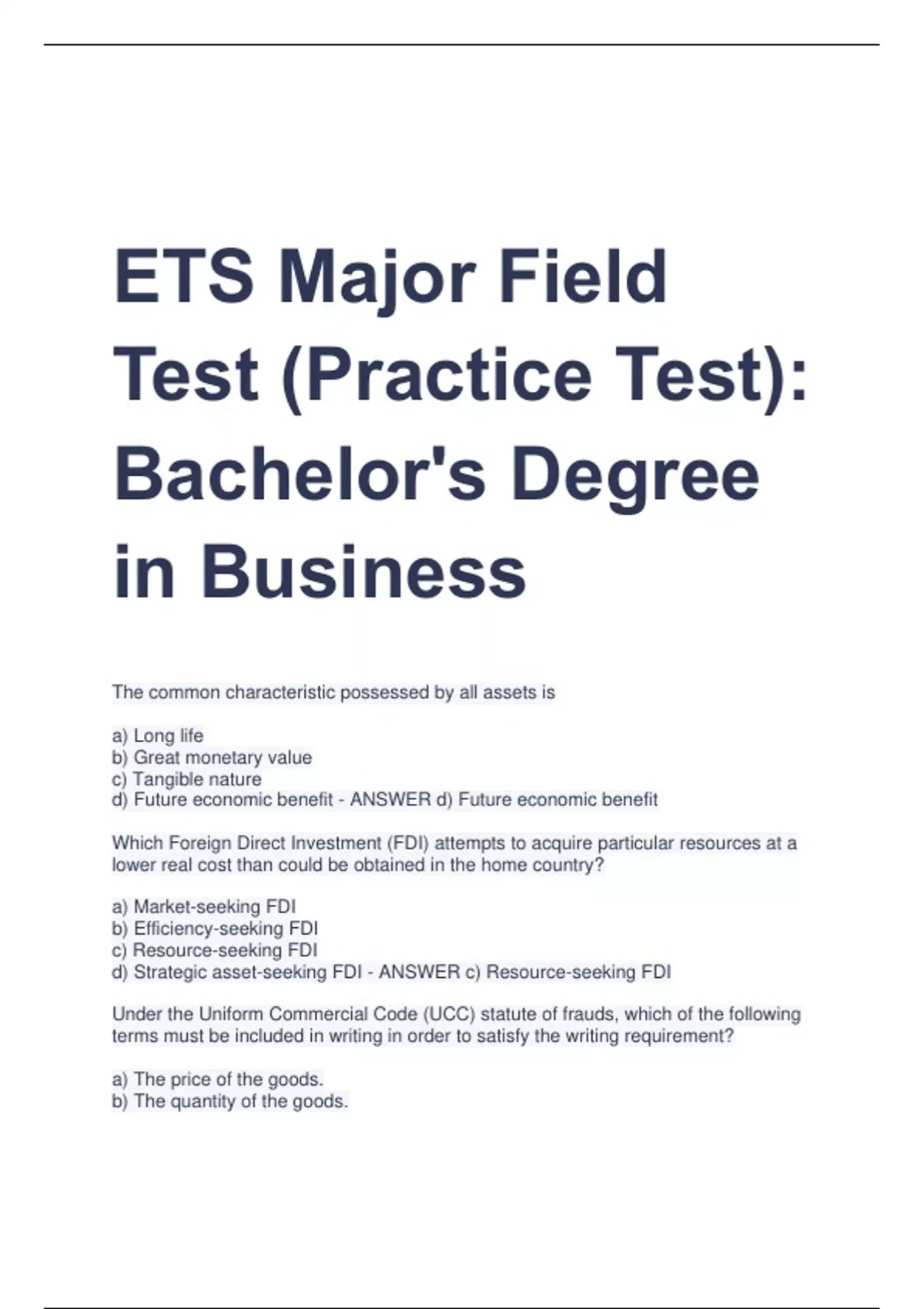 ETS Major Field Test (Practice Test): Bachelor's Degree in Business The common characteristic possessed by all assets is a) Long life b) Great monetary value c) Tangible nature d) Future economic benefit - ANSWER d) Future economic benefit Which Foreign Direct Investment (FDI) attempts to acquire particular resources at a lower real cost than could be obtained in the home country? a) Market-seeking FDI b) Efficiency-seeking FDI c) Resource-seeking FDI d) Strategic asset-seeking FDI - ANSWER c) Resource-seeking FDI Under the Uniform Commercial Code (UCC) statute of frauds, which of the following terms must be included in writing in order to satisfy the writing requirement? a) The price of the goods. b) The quantity of the goods. c) The signatures and names of the buyer and the seller d) The time and place for delivery - ANSWER b) The quantity of the goods Which of the following is an appropriate Federal Reserve action to stimulate the United States economy? a) Selling government bonds on the open market b) Increasing the discount rate c) Reducing the reserve requirement d) Cutting taxes - ANSWER c) Reducing the reserve requirement Which of the following is true with regard to an exculpatory clause? a) An exculpatory clause excuses one party from liability for his/her own tortious conduct. b) Where one party has a superior bargaining position that has enabled him/her to impose an exculpatory clause upon the other, the courts are inclined to nullify the provision. c) An exculpatory clause may be unenforceable for unconscionability. d) All of the above are true - ANSWER d) All of the above are true Managers at ABC, Inc. analyze the current situation of their organization and then develop plans to help their organization to accomplish its mission and achieve its goals. This is known as: a) Synergy planning b) Strategy formulation c) Functional planning d) SWOT analysis - ANSWER b) Strategy formulation A group that develops naturally as a result of employees' interaction within an organization is referred to as a) an informal group b) a formal group c) a work-team group d) a formation group - ANSWER a) an informal group When employees use email, word processors, electronic scheduling / calendars, they are using which of the following? a) Transaction processing systems b) Process control systems c) Office automation systems d) Decision support systems - ANSWER c) Office automation systems A standard procedure for numerically measuring a project's progress, forecasting its completion date and cost and providing measures of schedule and budget variation as activities are completed is referred to as a) program evaluation and review technique (PERT) b) the critical path method (CPM) c) a Gantt chart d) earned value analysis (EVA) - ANSWER d) earned value analysis (EVA) High product differentiation is generally accompanied by a) higher market share b) decreased emphasis on competition based on price c) higher profit margins and lower costs d) significant economies of scale - ANSWER b) decreased emphasis on competition based on price The essence of common law is: a) its prospective nature. b) the concept of stare decisis c) its flexibility d) the plain meaning doctrine - ANSWER b) the concept of stare decisis The Organization of the Petroleum Exporting Countries (OPEC) reduces production by 10 percent, and the growth rate of the world economy begins to escalate. How will the simultaneous occurrence of these events affect the equilibrium price and quantity in the world petroleum market? a) Price will increase, but quantity will remain unchanged b) Price will increase, but quantity is indeterminate c) Quantity will increase, but price is indeterminate d) Both price and quantity will increase - ANSWER b) Price will increase, but quantity is indeterminate Within the context of the capital asset pricing model (CAPM), the risk measure known as beta is often computed by regressing the return of the company's stock against the a) return on the company's bond
