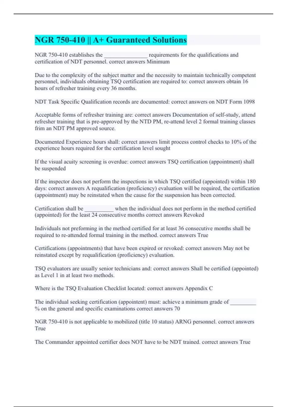 NGR 750-410 establishes the _______________ requirements for the qualifications and certification of NDT personnel. correct answers Minimum Due to the complexity of the subject matter and the necessity to maintain technically competent personnel, individuals obtaining TSQ certification are required to: correct answers obtain 16 hours of refresher training every 36 months. NDT Task Specific Qualification records are documented: correct answers on NDT Form 1098 Acceptable forms of refresher training are: correct answers Documentation of self-study, attend refresher training that is pre-approved by the NTD PM, re-attend level 2 formal training classes frim an NDT PM approved source. Documented Experience hours shall: correct answers limit process control checks to 10% of the experience hours required for the certification level sought If the visual acuity screening is overdue: correct answers TSQ certification (appointment) shall be suspended If the inspector does not perform the inspections in which TSQ certified (appointed) within 180 days: correct answers A requalification (proficiency) evaluation will be required, the certification (appointment) may be reinstated when the cause for the suspension has been corrected. Certification shall be __________ when the individual does not perform in the method certified (appointed) for the least 24 consecutive months correct answers Revoked Individuals not preforming in the method certified for at least 36 consecutive months shall be required to re-attended formal training in the method. correct answers True Certifications (appointments) that have been expired or revoked: correct answers May not be reinstated except by requalification (proficiency) evaluation. TSQ evaluators are usually senior technicians and: correct answers Shall be certified (appointed) as Level 1 in at least two methods. Where is the TSQ Evaluation Checklist located: correct answers Appendix C The individual seeking certification (appointent) must: achieve a minimum grade of _________% on the general and specific examinations correct answers 70 NGR 750-410 is not applicable to mobilized (title 10 status) ARNG personnel. correct answers True The Commander appointed certifier does NOT have to be NDT trained. correct answers True