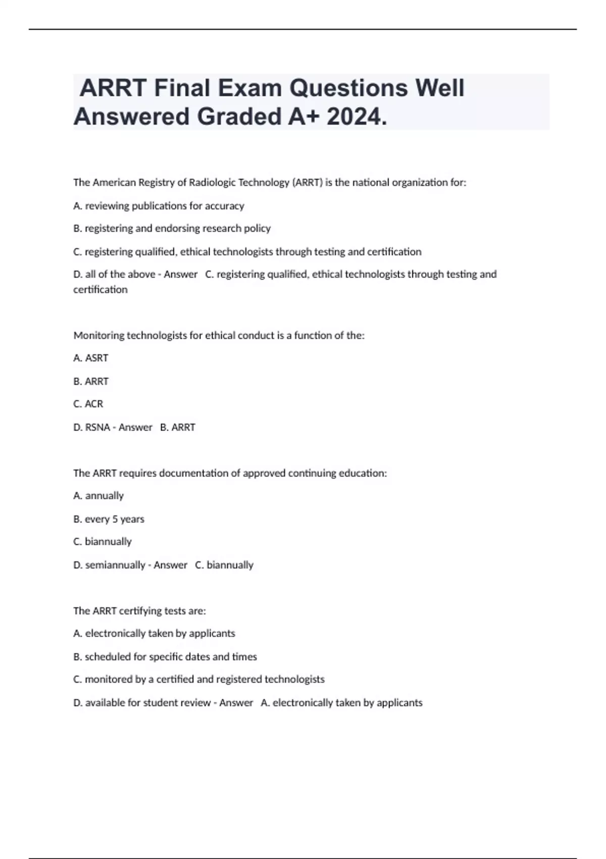 The American Registry of Radiologic Technology (ARRT) is the national organization for: A. reviewing publications for accuracy B. registering and endorsing research policy C. registering qualified, ethical technologists through testing and certification D. all of the above - Answer C. registering qualified, ethical technologists through testing and certification Monitoring technologists for ethical conduct is a function of the: A. ASRT B. ARRT C. ACR D. RSNA - Answer B. ARRT The ARRT requires documentation of approved continuing education: A. annually B. every 5 years C. biannually D. semiannually - Answer C. biannually The ARRT certifying tests are: A. electronically taken by applicants B. scheduled for specific dates and times C. monitored by a certified and registered technologists D. available for student review - Answer A. electronically taken by applicants ARRT certification requirements consist of: