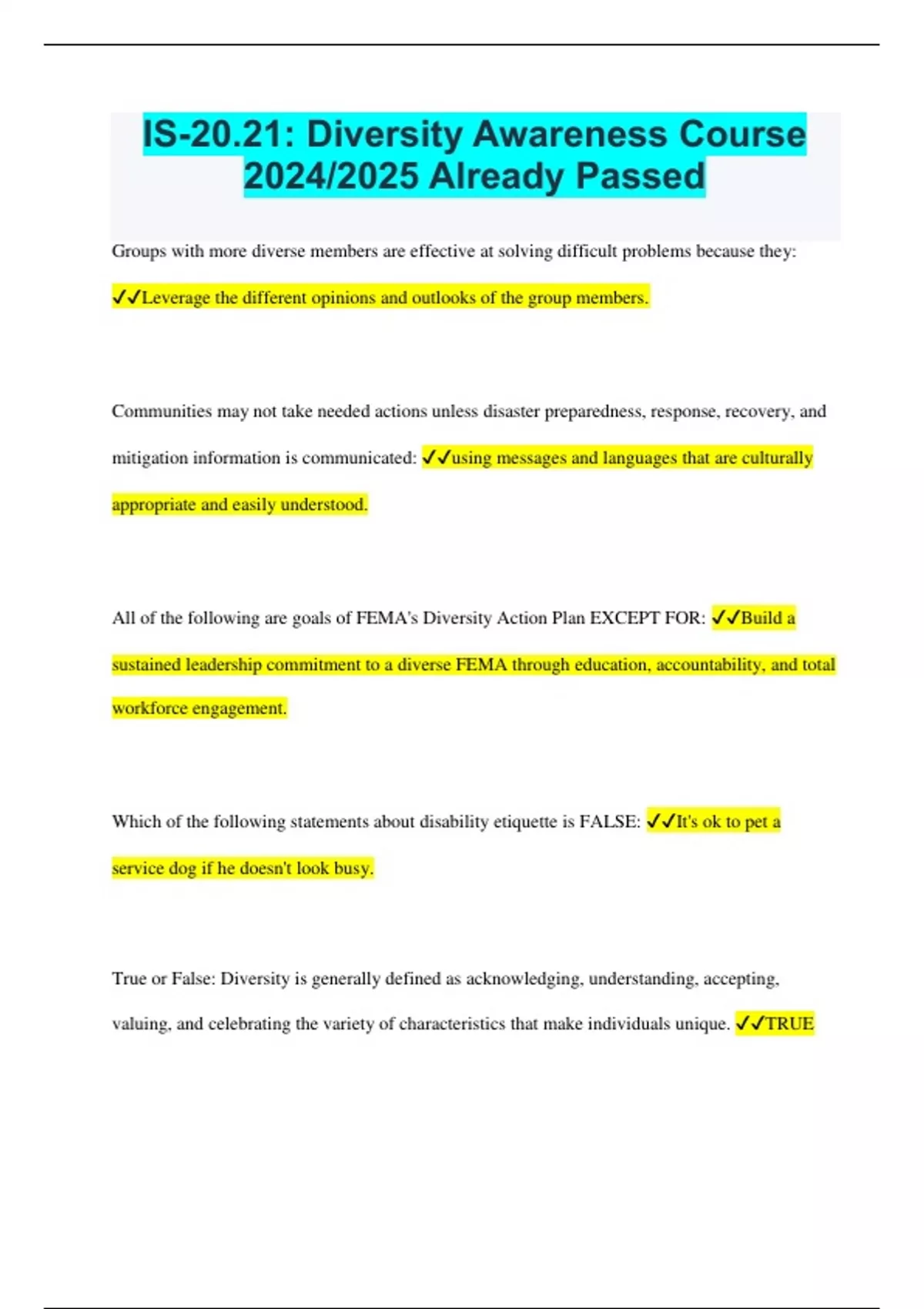 IS-20.21: Diversity Awareness Course 2024/2025 Already Passed Groups with more diverse members are effective at solving difficult problems because they: Leverage the different opinions and outlooks of the group members. Communities may not take needed actions unless disaster preparedness, response, recovery, and mitigation information is communicated: using messages and languages that are culturally appropriate and easily understood. All of the following are goals of FEMA's Diversity Action Plan EXCEPT FOR: Build a sustained leadership commitment to a diverse FEMA through education, accountability, and total workforce engagement. Which of the following statements about disability etiquette is FALSE: It's ok to pet a service dog if he doesn't look busy. True or False: Diversity is generally defined as acknowledging, understanding, accepting, valuing, and celebrating the variety of characteristics that make individuals unique. TRUE True or false: Something as simple as the way you introduce yourself can bridge cultural differences and improve understanding of disaster assistance programs. FALSE True or False: Being nice to each other is enough for optimizing diversity. FLASE True or False: During deployment of the disaster workforce, the Federal Coordinating Officer has the sole responsibility for fostering a positive and inclusive culture. FLASE True or False: According to the U.S. Census Bureau, our population is becoming more racially and ethnically similar. FALSE Diversity also applies to the different generations in the workplace. Generations may have different (choose all that apply): All of the above The FEMA Diversity Council Serve as "change agents" focused on creating a "culture of diversity" across FEMA through (Select ALL that apply): - visible commitment and frequent communication. - by making diversity a key factor in organizational planning. (Both A and C.) True or False: Section 508 only effects employees who work with technology and procurement, not employees such as meeting coordinators, content authors, or professional disaster response employees. FALSE The term "diversity" is often associated with race and ethnicity; however, diversity encompasses both external and _________ characteristics