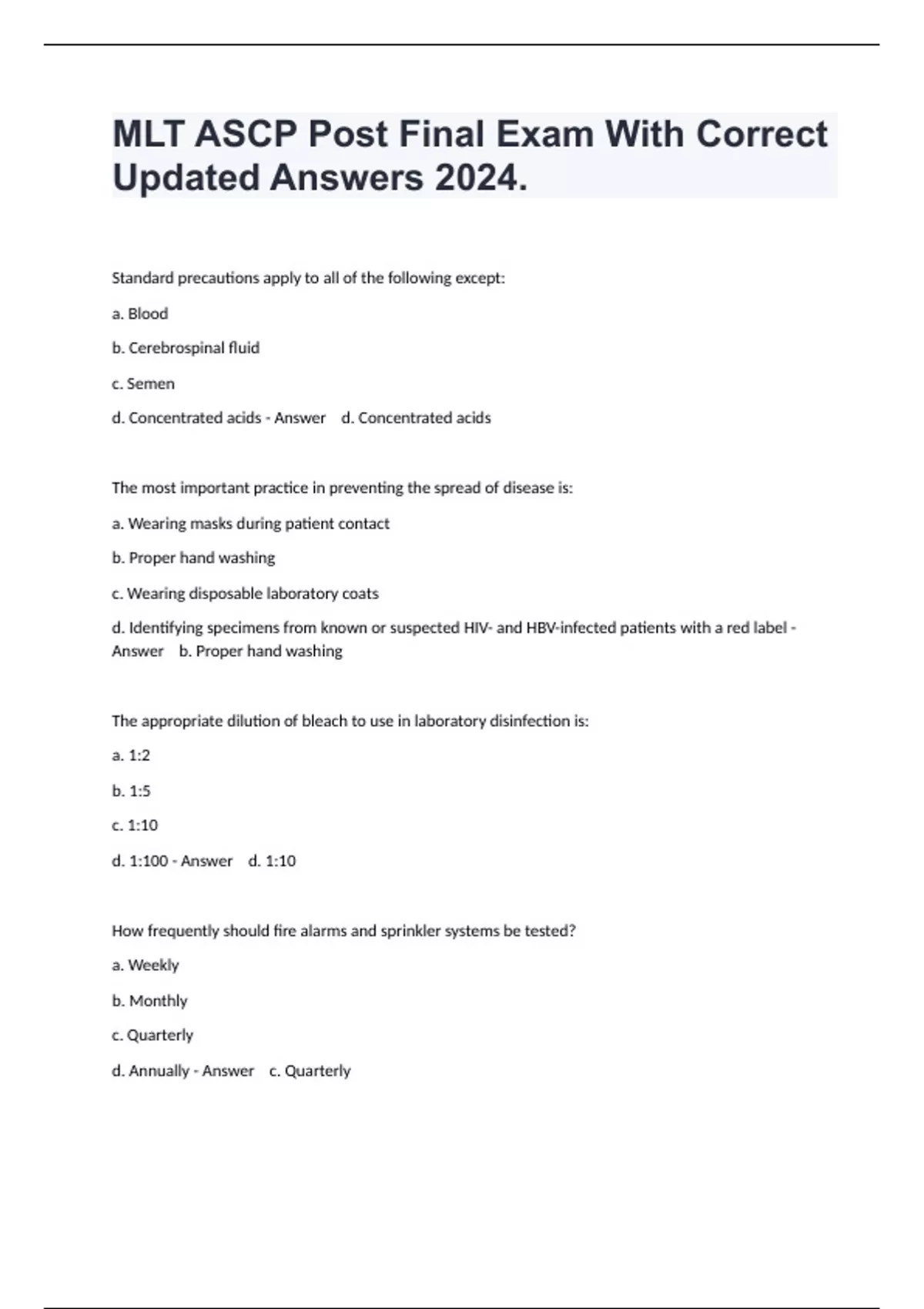 Standard precautions apply to all of the following except: a. Blood b. Cerebrospinal fluid c. Semen d. Concentrated acids - Answer d. Concentrated acids The most important practice in preventing the spread of disease is: a. Wearing masks during patient contact b. Proper hand washing c. Wearing disposable laboratory coats d. Identifying specimens from known or suspected HIV- and HBV-infected patients with a red label - Answer b. Proper hand washing The appropriate dilution of bleach to use in laboratory disinfection is: a. 1:2 b. 1:5 c. 1:10 d. 1:100 - Answer d. 1:10 How frequently should fire alarms and sprinkler systems be tested? a. Weekly b. Monthly c. Quarterly d. Annually - Answer c. Quarterly