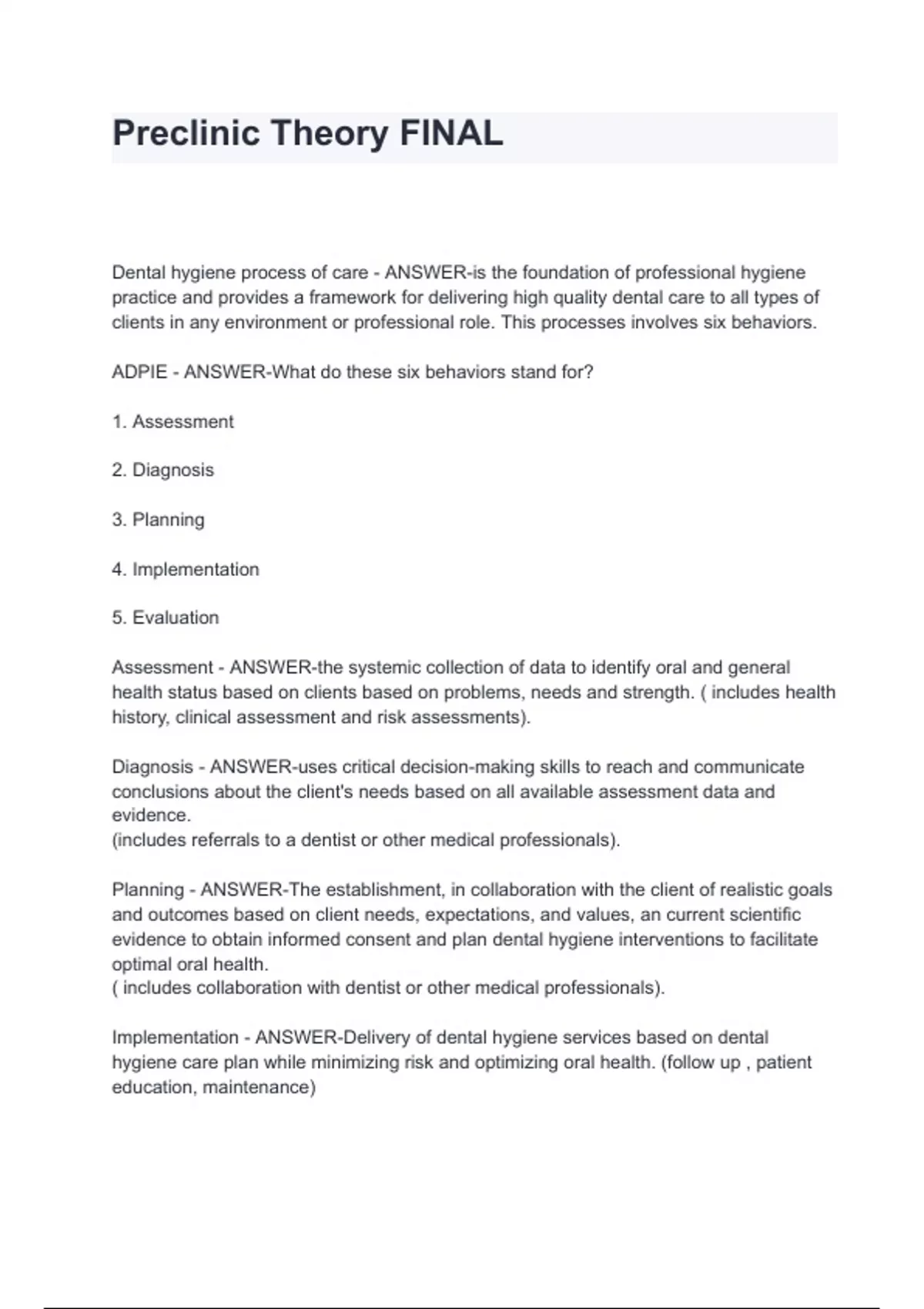 Dental hygiene process of care - ANSWER-is the foundation of professional hygiene practice and provides a framework for delivering high quality dental care to all types of clients in any environment or professional role. This processes involves six behaviors. ADPIE - ANSWER-What do these six behaviors stand for? 1. Assessment 2. Diagnosis 3. Planning 4. Implementation 5. Evaluation Assessment - ANSWER-the systemic collection of data to identify oral and general health status based on clients based on problems, needs and strength. ( includes health history, clinical assessment and risk assessments). Diagnosis - ANSWER-uses critical decision-making skills to reach and communicate conclusions about the client's needs based on all available assessment data and evidence. (includes referrals to a dentist or other medical professionals). Planning - ANSWER-The establishment, in collaboration with the client of realistic goals and outcomes based on client needs, expectations, and values, an current scientific evidence to obtain informed consent and plan dental hygiene interventions to facilitate optimal oral health. ( includes collaboration with dentist or other medical professionals). Implementation - ANSWER-Delivery of dental hygiene services based on dental hygiene care plan while minimizing risk and optimizing oral health. (follow up , patient education, maintenance)