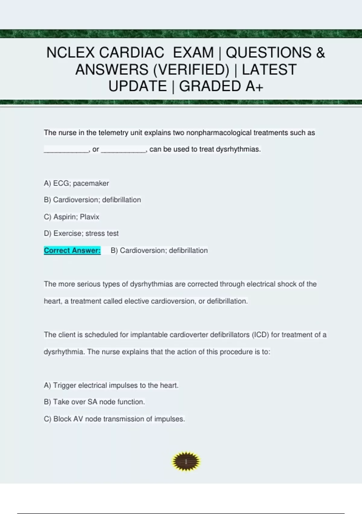 NCLEX CARDIAC EXAM | QUESTIONS & ANSWERS (VERIFIED) | LATEST UPDATE | GRADED A+NCLEX CARDIAC EXAM | QUESTIONS & ANSWERS (VERIFIED) | LATEST UPDATE | GRADED A+