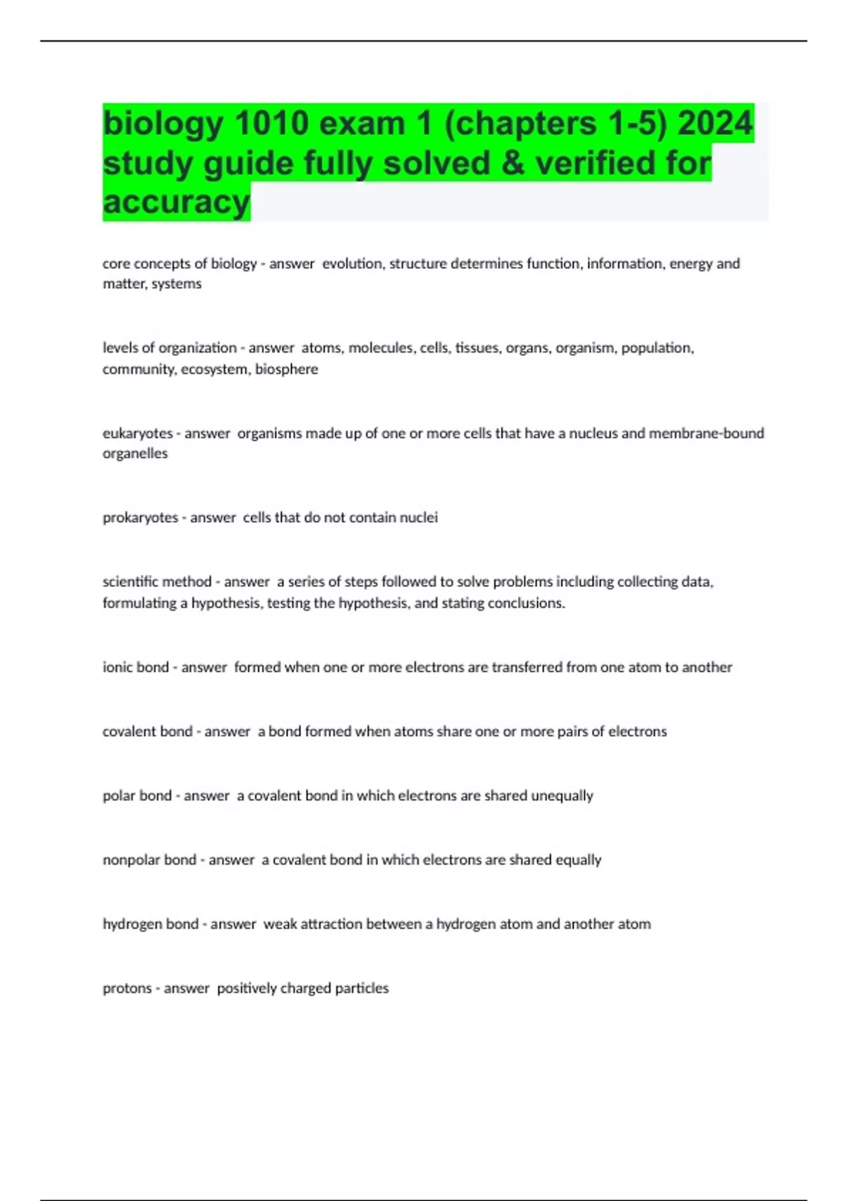 BIO 1010 Exam 1 2024 study guide fully solved & verified for accuracy