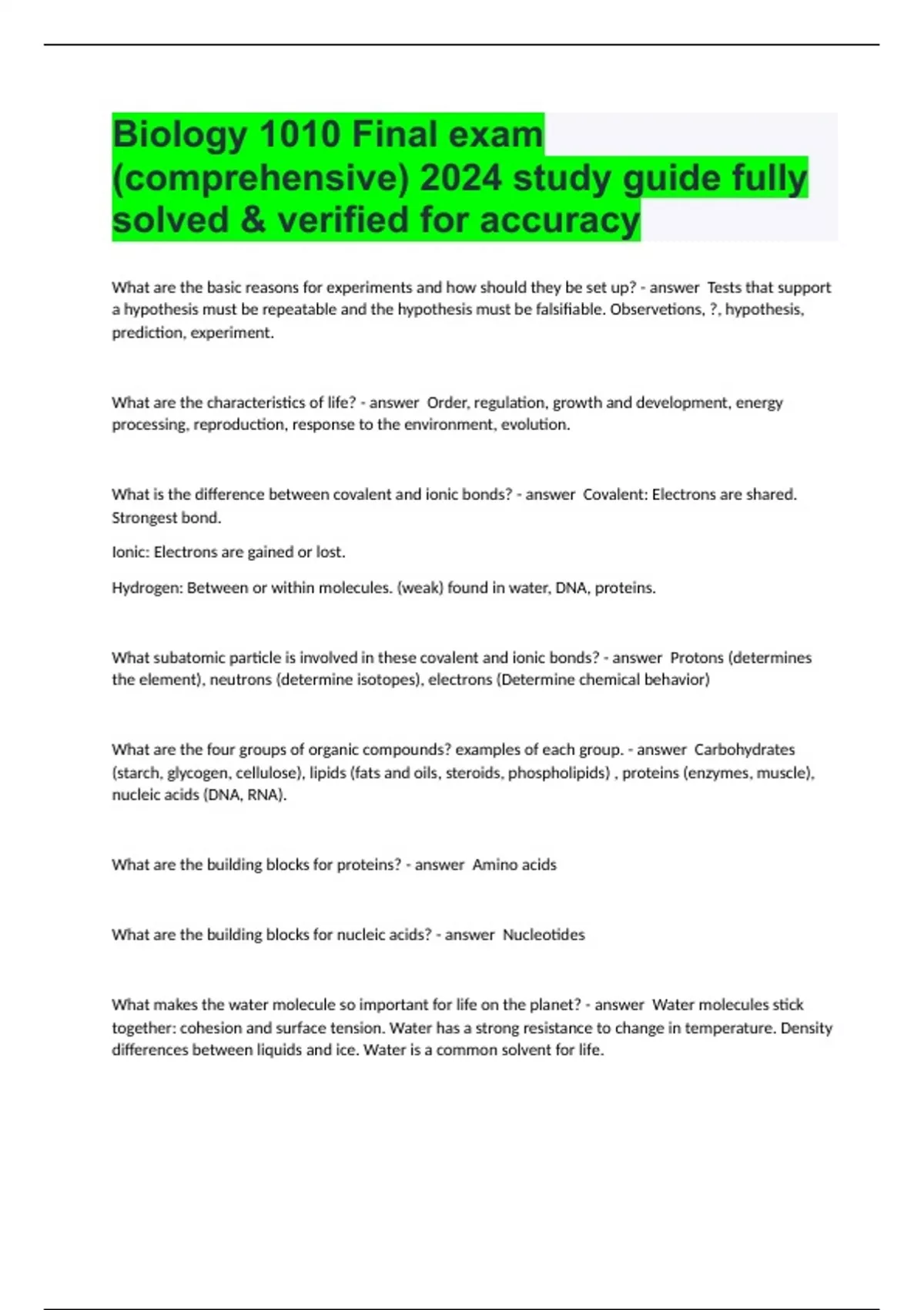 Biology 1010 Final exam (comprehensive) 2024 study guide fully solved & verified for accuracy