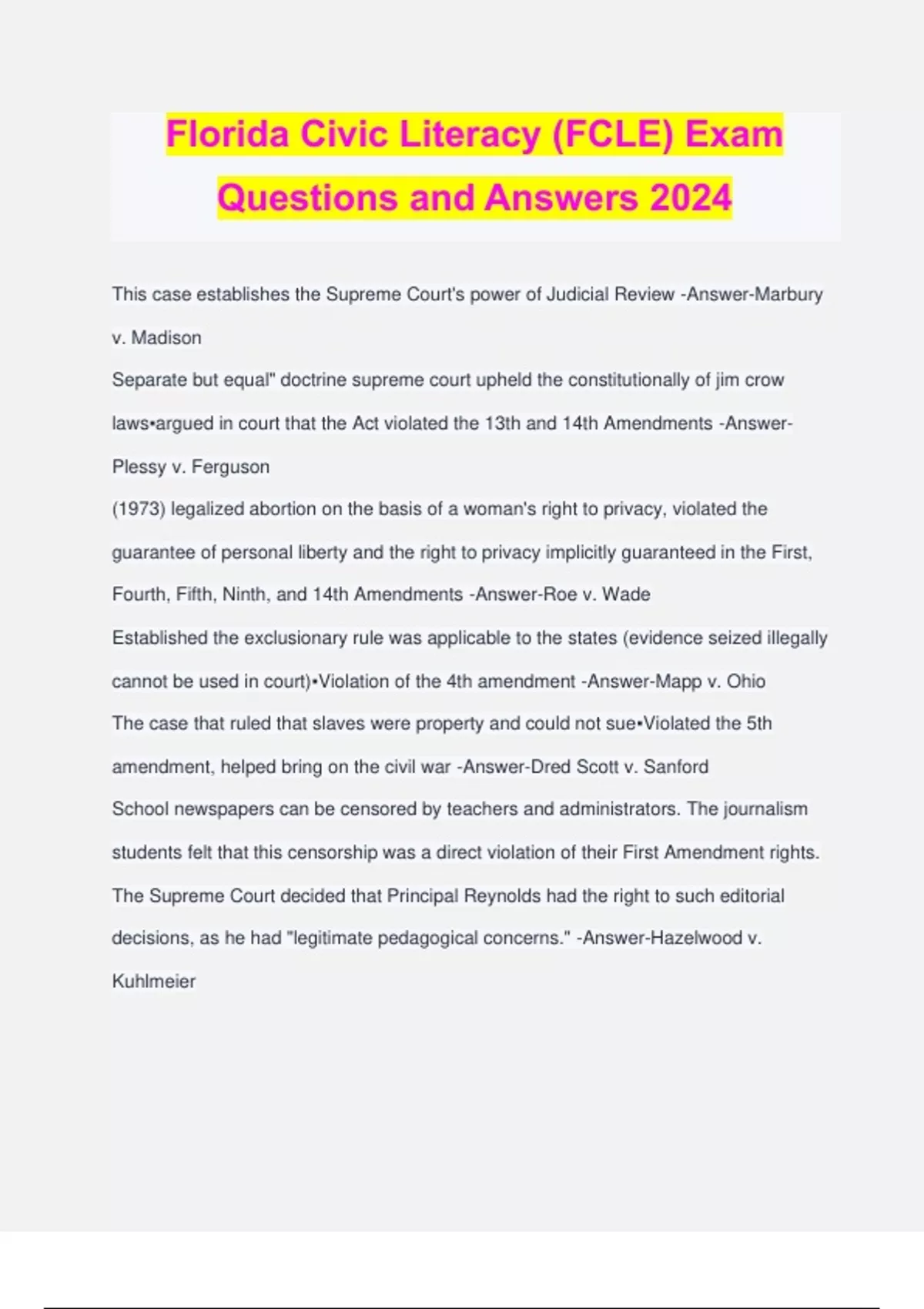 Florida Civic Literacy (FCLE) Exam Questions and Answers 2024 This case establishes the Supreme Court's power of Judicial Review -Answer-Marbury v. Madison Separate but equal" doctrine supreme court upheld the constitutionally of jim crow laws▪argued in court that the Act violated the 13th and 14th Amendments -Answer- Plessy v. Ferguson (1973) legalized abortion on the basis of a woman's right to privacy, violated the guarantee of personal liberty and the right to privacy implicitly guaranteed in the First, Fourth, Fifth, Ninth, and 14th Amendments -Answer-Roe v. Wade Established the exclusionary rule was applicable to the states (evidence seized illegally cannot be used in court)▪Violation of the 4th amendment -Answer-Mapp v. Ohio The case that ruled that slaves were property and could not sue▪Violated the 5th amendment, helped bring on the civil war -Answer-Dred Scott v. Sanford School newspapers can be censored by teachers and administrators. The journalism students felt that this censorship was a direct violation of their First Amendment rights. The Supreme Court decided that Principal Reynolds had the right to such editorial decisions, as he had "legitimate pedagogical concerns." -Answer-Hazelwood v. Kuhlmeier 1954 case that overturned Separate but Equal standard of discrimination in education.▪Her family believed that the segregated school system violated the 14th Amendment and took their case to court. -Answer-Brown v. Board of Education Maryland was trying to tax the national bank and Supreme Court ruled that federal law was stronger than the state law -Answer-McCulloch v. Maryland A 1989 case in which the Supreme Court struck down a law banning the burning of the American flag on the grounds that such action was symbolic speech protected by the First Amendment. -Answer-Texas v. Johnson U.S. Supreme Court case that limited executive privilege -Answer-United States v. Nixon a landmark case in United States Supreme Court history. In the case, the Supreme Court unanimously ruled that state courts are required under the Sixth Amendment of the Constitution to provide counsel in criminal cases for defendants unable to afford their own attorneys. -Answer-Gideon v. Wainwright Regulating interstate commerce is a power reserved to the federal government - Answer-Gibbons v. Ogden Supreme Court held that criminal suspects must be informed of their right to consult with an attorney and of their right against self-incrimination prior to questioning by police. Violated the 5th amendment and his 6th, right to an attorney. Case topic: self- incrimination, due process -Answer-Miranda v. Arizona Students have the right to symbolic speech at school as long as it is not disruptive, protected but he 1st amendment -Answer-Tinker v. Des Moines