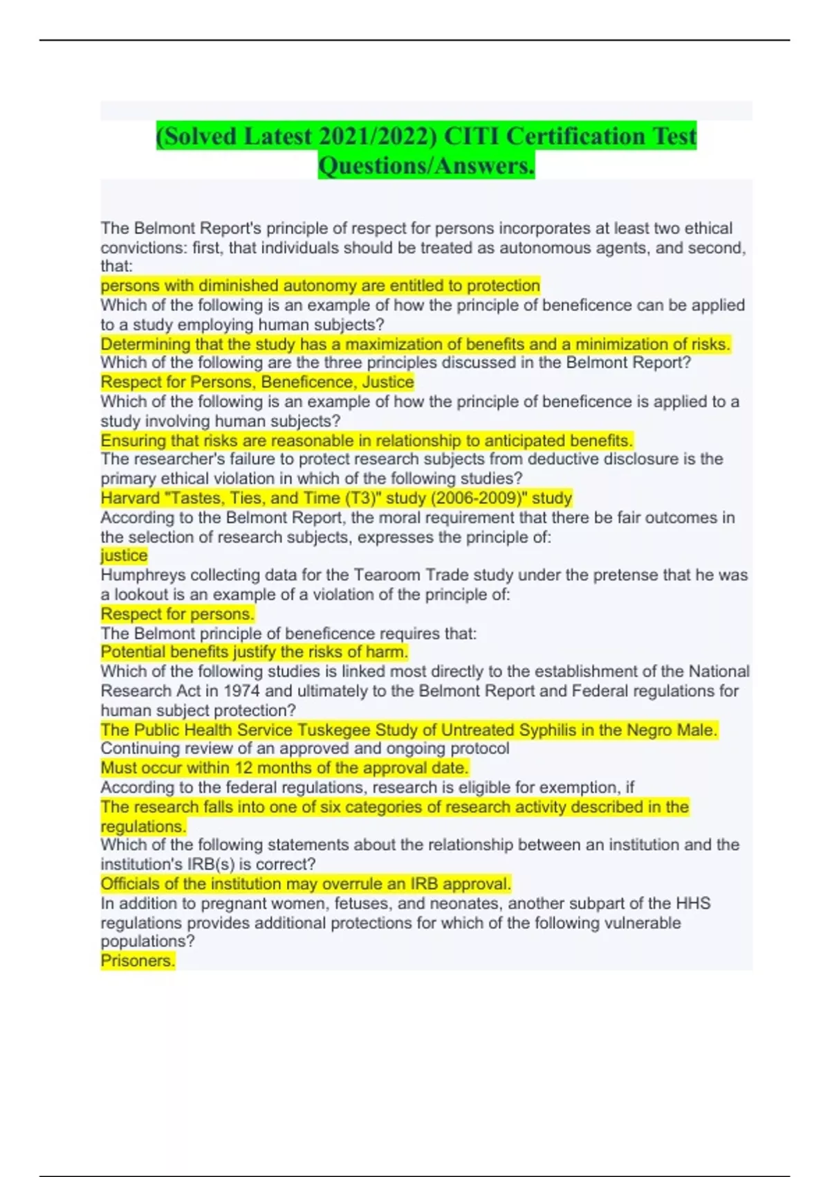 (Solved Latest 2021/2022) CITI Certification Test Questions/Answers.