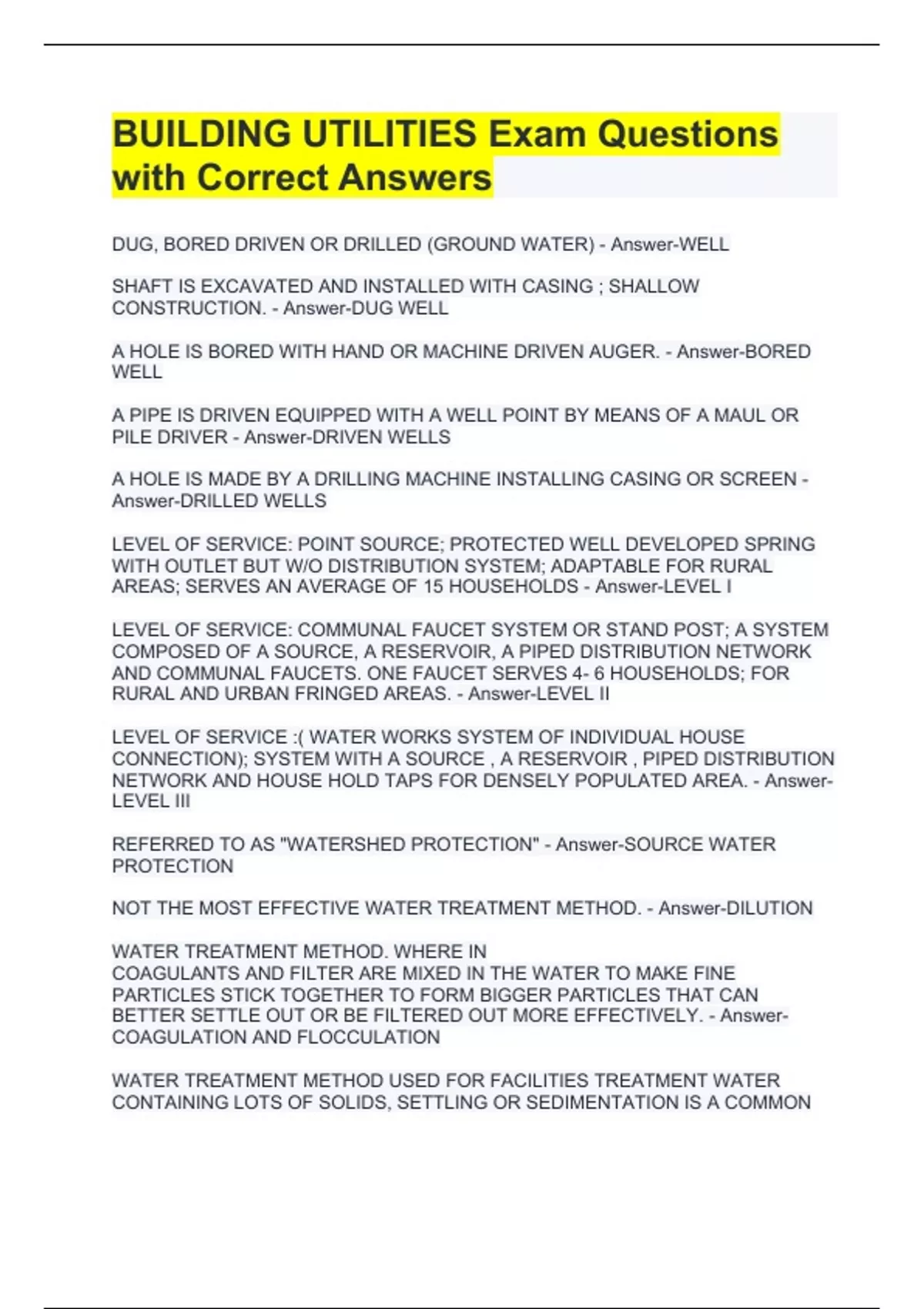 DUG, BORED DRIVEN OR DRILLED (GROUND WATER) - Answer-WELL SHAFT IS EXCAVATED AND INSTALLED WITH CASING ; SHALLOW CONSTRUCTION. - Answer-DUG WELL A HOLE IS BORED WITH HAND OR MACHINE DRIVEN AUGER. - Answer-BORED WELL A PIPE IS DRIVEN EQUIPPED WITH A WELL POINT BY MEANS OF A MAUL OR PILE DRIVER - Answer-DRIVEN WELLS A HOLE IS MADE BY A DRILLING MACHINE INSTALLING CASING OR SCREEN - Answer-DRILLED WELLS LEVEL OF SERVICE: POINT SOURCE; PROTECTED WELL DEVELOPED SPRING WITH OUTLET BUT W/O DISTRIBUTION SYSTEM; ADAPTABLE FOR RURAL AREAS; SERVES AN AVERAGE OF 15 HOUSEHOLDS - Answer-LEVEL I LEVEL OF SERVICE: COMMUNAL FAUCET SYSTEM OR STAND POST; A SYSTEM COMPOSED OF A SOURCE, A RESERVOIR, A PIPED DISTRIBUTION NETWORK AND COMMUNAL FAUCETS. ONE FAUCET SERVES 4- 6 HOUSEHOLDS; FOR RURAL AND URBAN FRINGED AREAS. - Answer-LEVEL II LEVEL OF SERVICE :( WATER WORKS SYSTEM OF INDIVIDUAL HOUSE CONNECTION); SYSTEM WITH A SOURCE , A RESERVOIR , PIPED DISTRIBUTION NETWORK AND HOUSE HOLD TAPS FOR DENSELY POPULATED AREA. - Answer-LEVEL III REFERRED TO AS "WATERSHED PROTECTION" - Answer-SOURCE WATER PROTECTION NOT THE MOST EFFECTIVE WATER TREATMENT METHOD. - Answer-DILUTION WATER TREATMENT METHOD. WHERE IN COAGULANTS AND FILTER ARE MIXED IN THE WATER TO MAKE FINE PARTICLES STICK TOGETHER TO FORM BIGGER PARTICLES THAT CAN BETTER SETTLE OUT OR BE FILTERED OUT MORE EFFECTIVELY. - Answer-COAGULATION AND FLOCCULATION WATER TREATMENT METHOD USED FOR FACILITIES TREATMENT WATER CONTAINING LOTS OF SOLIDS, SETTLING OR SEDIMENTATION IS A COMMON