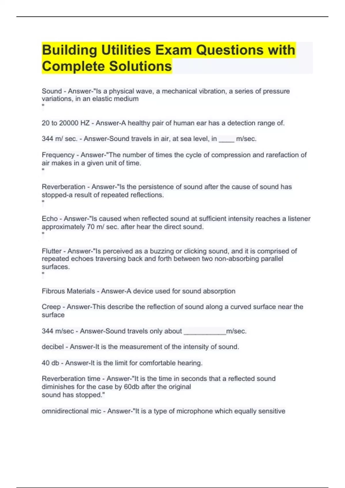 Sound - Answer-"Is a physical wave, a mechanical vibration, a series of pressure variations, in an elastic medium " 20 to 20000 HZ - Answer-A healthy pair of human ear has a detection range of. 344 m/ sec. - Answer-Sound travels in air, at sea level, in ____ m/sec. Frequency - Answer-"The number of times the cycle of compression and rarefaction of air makes in a given unit of time. " Reverberation - Answer-"Is the persistence of sound after the cause of sound has stopped-a result of repeated reflections. " Echo - Answer-"Is caused when reflected sound at sufficient intensity reaches a listener approximately 70 m/ sec. after hear the direct sound. " Flutter - Answer-"Is perceived as a buzzing or clicking sound, and it is comprised of repeated echoes traversing back and forth between two non-absorbing parallel surfaces. " Fibrous Materials - Answer-A device used for sound absorption Creep - Answer-This describe the reflection of sound along a curved surface near the surface 344 m/sec - Answer-Sound travels only about ___________m/sec. decibel - Answer-It is the measurement of the intensity of sound. 40 db - Answer-It is the limit for comfortable hearing. Reverberation time - Answer-"It is the time in seconds that a reflected sound diminishes for the case by 60db after the original sound has stopped." omnidirectional mic - Answer-"It is a type of microphone which equally sensitive