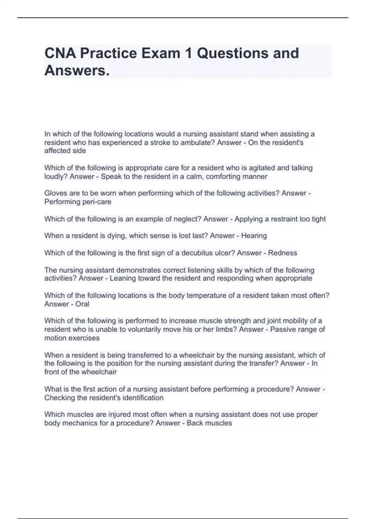 cna practice exam 1 questions and answers