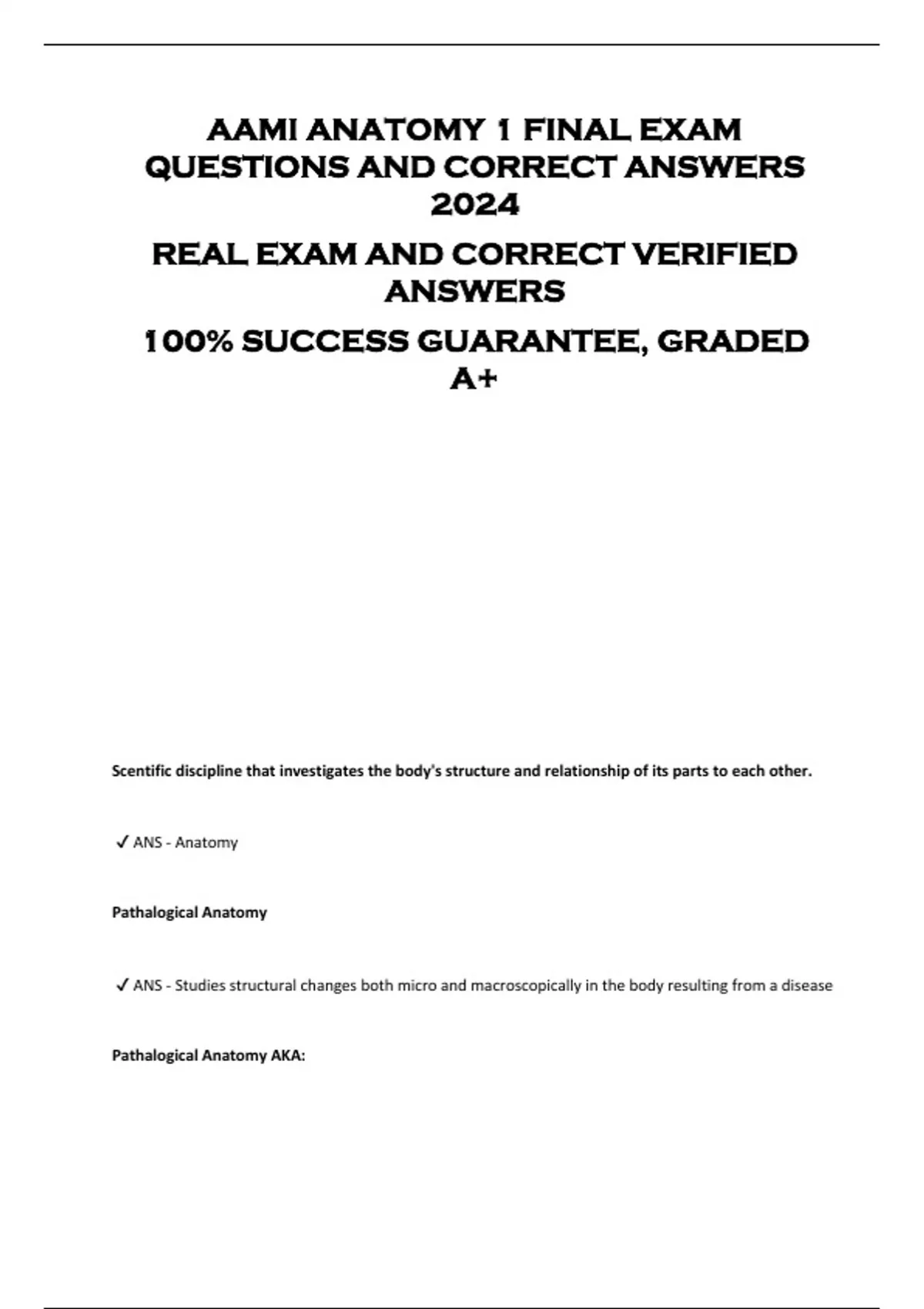 AAMI ANATOMY 1 FINAL EXAM QUESTIONS AND CORRECT ANSWERS 2024 REAL EXAM AND CORRECT VERIFIED ANSWERS 100% SUCCESS GUARANTEE, GRADED A+ Scentific discipline that investigates the body's structure and relationship of its parts to each other. ✔ ANS - Anatomy Pathalogical Anatomy ✔ ANS - Studies structural changes both micro and macroscopically in the body resulting from a disease Pathalogical Anatomy AKA: ✔ ANS - Morbid Anatomy Physiological Anatomy ✔ ANS - Studies how the body works or Functions of living things Physiolo gical Anatomy AKA: ✔ ANS - Physiology Gross Anatomy ✔ ANS - Study of structures without a microscope or only with the unaided eye Gross Anatomy AKA: ✔ ANS - Macro -Scopic Anatomy Microscopic Anatomy ✔ ANS - Study of a structure with a microscope Subdivision of Microscopic Anatomy ✔ ANS - Histology - Study of Tissue Cytology - Study of individual cell structure Microscopic Anatomy sometimes used interchangeably as a term with ✔ ANS - Histology Systemic Anatomy ✔ ANS - Study of the body by individual system Regional Anatomy ✔ ANS - Study of a particular body region Describe Anatomical Position (5) ✔ ANS - Standing Erect Facing Observer Feet flat on the floor Upper extremities at sides Palms facing Anteriorly Prone ✔ ANS - Anterior Surface down / lying face up Supine ✔ ANS - Anterior surface up / lying face down Anterior ✔ ANS - AKA: Ventral Closer to the front of the body Posterior ✔ ANS - AKA: Dorsal Closer to the back of the body Medial ✔ ANS - Toward the midline or mediam plane of the body Lateral ✔ ANS - Location away from the median plane Superior ✔ ANS - Toward head