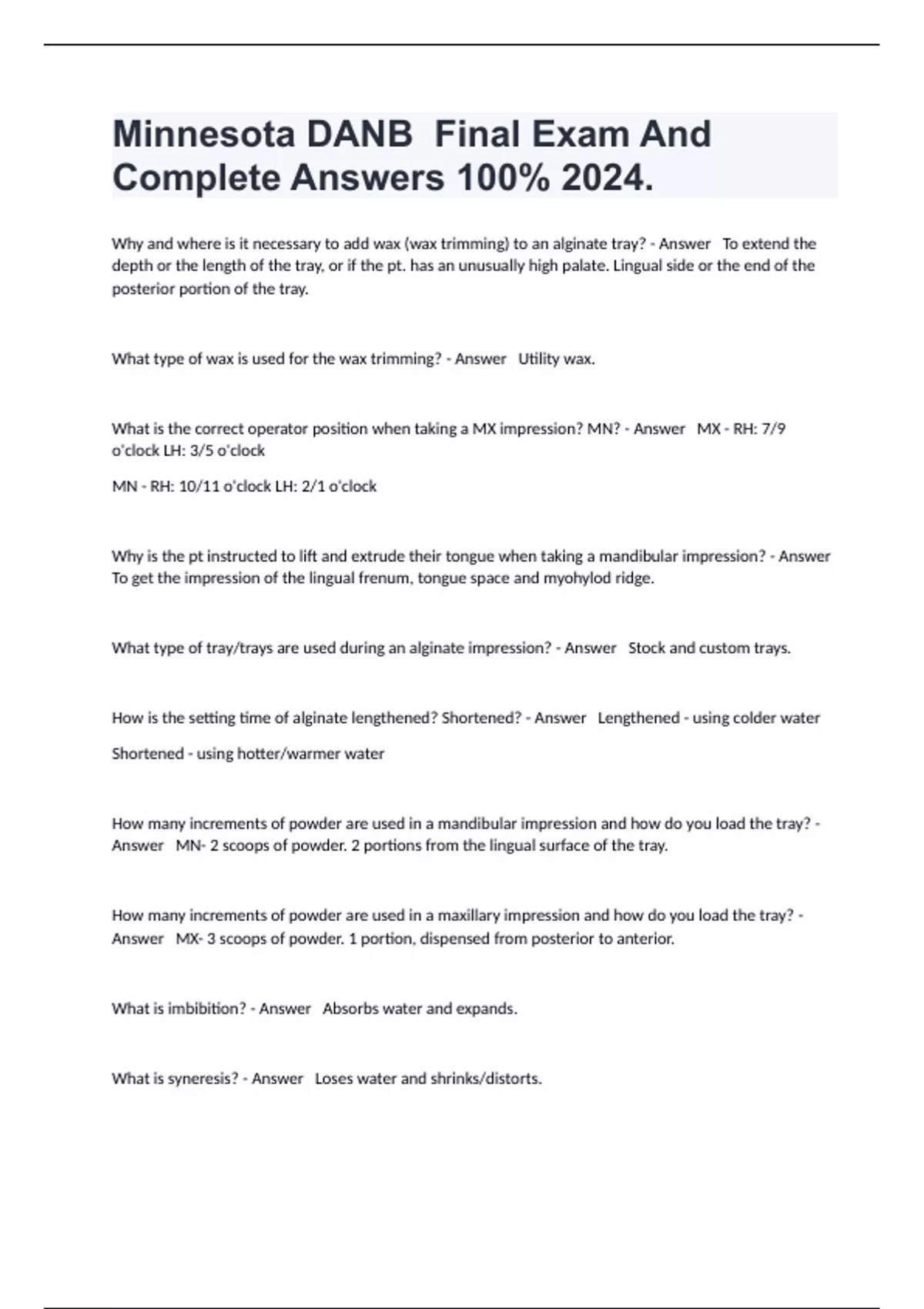 Why and where is it necessary to add wax (wax trimming) to an alginate tray? - Answer To extend the depth or the length of the tray, or if the pt. has an unusually high palate. Lingual side or the end of the posterior portion of the tray. What type of wax is used for the wax trimming? - Answer Utility wax. What is the correct operator position when taking a MX impression? MN? - Answer MX - RH: 7/9 o'clock LH: 3/5 o'clock MN - RH: 10/11 o'clock LH: 2/1 o'clock Why is the pt instructed to lift and extrude their tongue when taking a mandibular impression? - Answer To get the impression of the lingual frenum, tongue space and myohylod ridge. What type of tray/trays are used during an alginate impression? - Answer Stock and custom trays. How is the setting time of alginate lengthened? Shortened? - Answer Lengthened - using colder water Shortened - using hotter/warmer water How many increments of powder are used in a mandibular impression and how do you load the tray? - Answer MN- 2 scoops of powder. 2 portions from the lingual surface of the tray. How many increments of powder are used in a maxillary impression and how do you load the tray? - Answer MX- 3 scoops of powder. 1 portion, dispensed from posterior to anterior. What is imbibition? - Answer Absorbs water and expands. What is syneresis? - Answer Loses water and shrinks/distorts