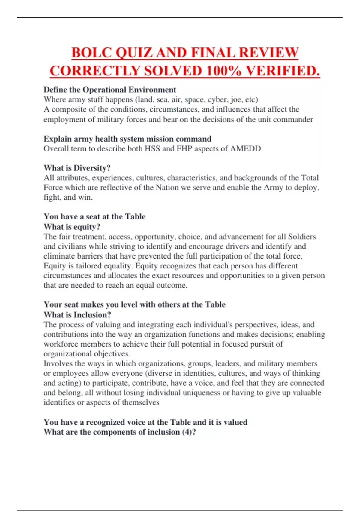 BOLC QUIZ AND FINAL REVIEW CORRECTLY SOLVED 100% VERIFIED.