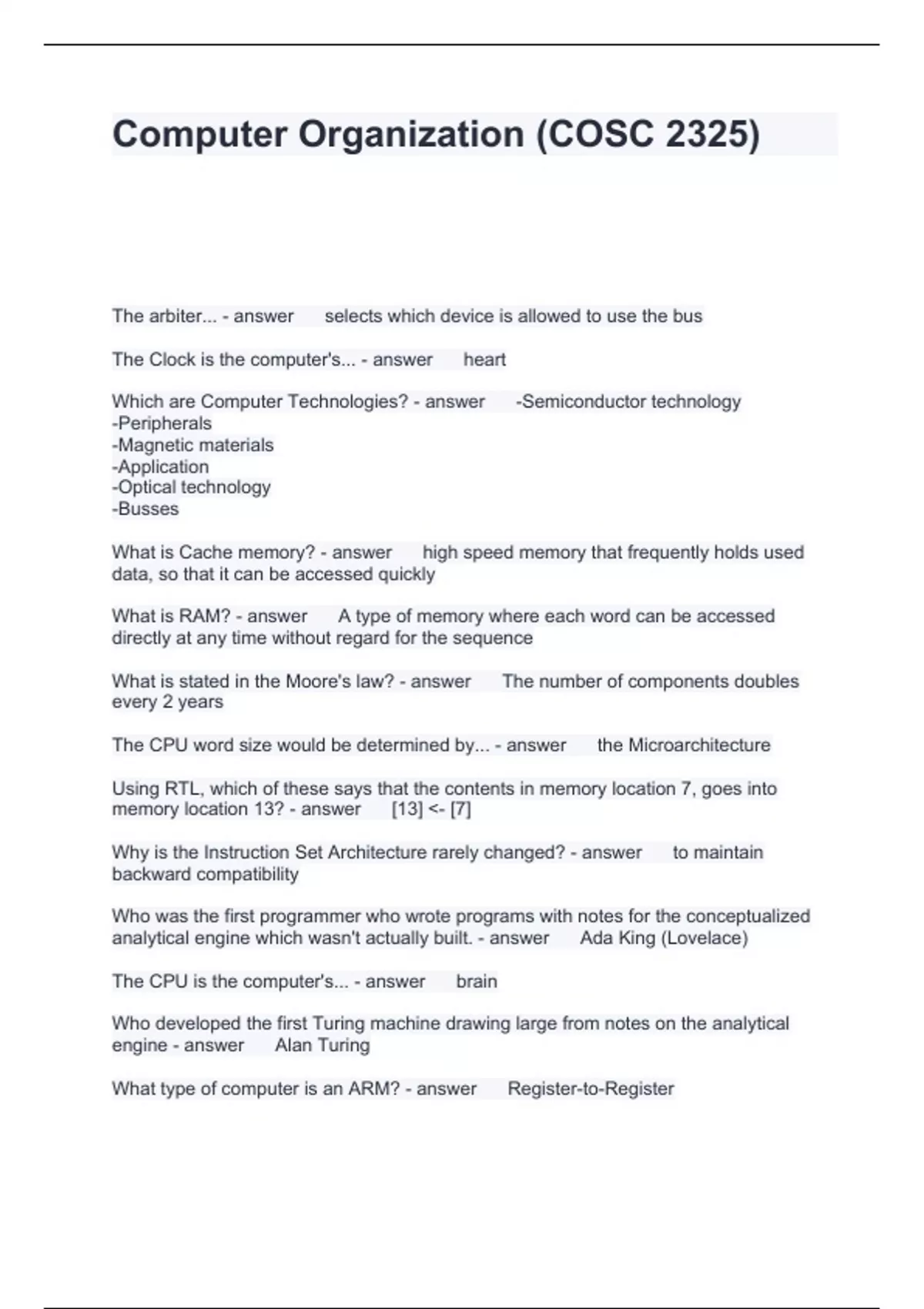 Computer Organization (COSC 2325) Questions and Answers 2024