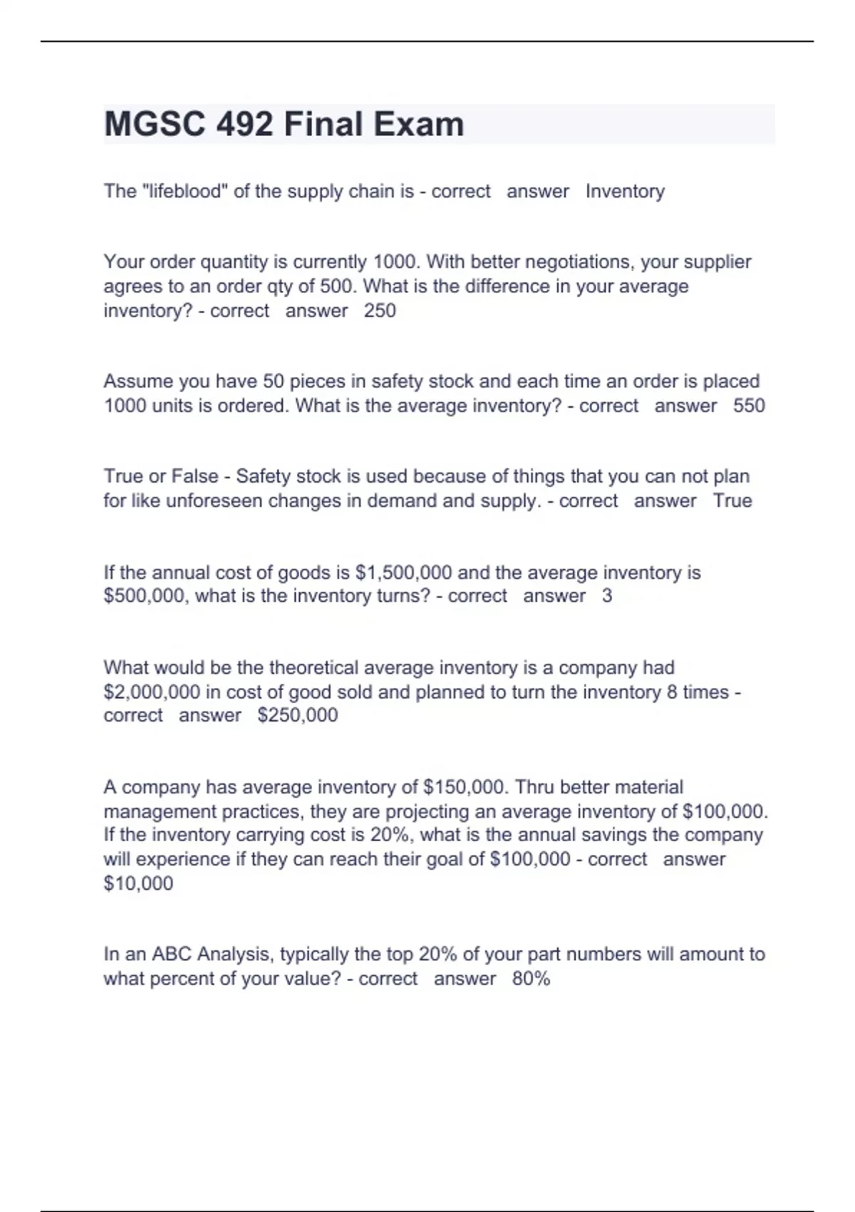 MGSC 492 Final Exam Question and answer correctly solved 2024/2025The "lifeblood" of the supply chain is - correct answer Inventory Your order quantity is currently 1000. With better negotiations, your supplier agrees to an order qty of 500. What is the difference in your average inventory? - correct answer 250 Assume you have 50 pieces in safety stock and each time an order is placed 1000 units is ordered. What is the average inventory? - correct answer 550 True or False - Safety stock is used because of things that you can not plan for like unforeseen changes in demand and supply. - correct answer True If the annual cost of goods is $1,500,000 and the average inventory is $500,000, what is the inventory turns? - correct answer 3 What would be the theoretical average inventory is a company had $2,000,000 in cost of good sold and planned to turn the inventory 8 times - correct answer $250,000 A company has average inventory of $150,000. Thru better material management practices, they