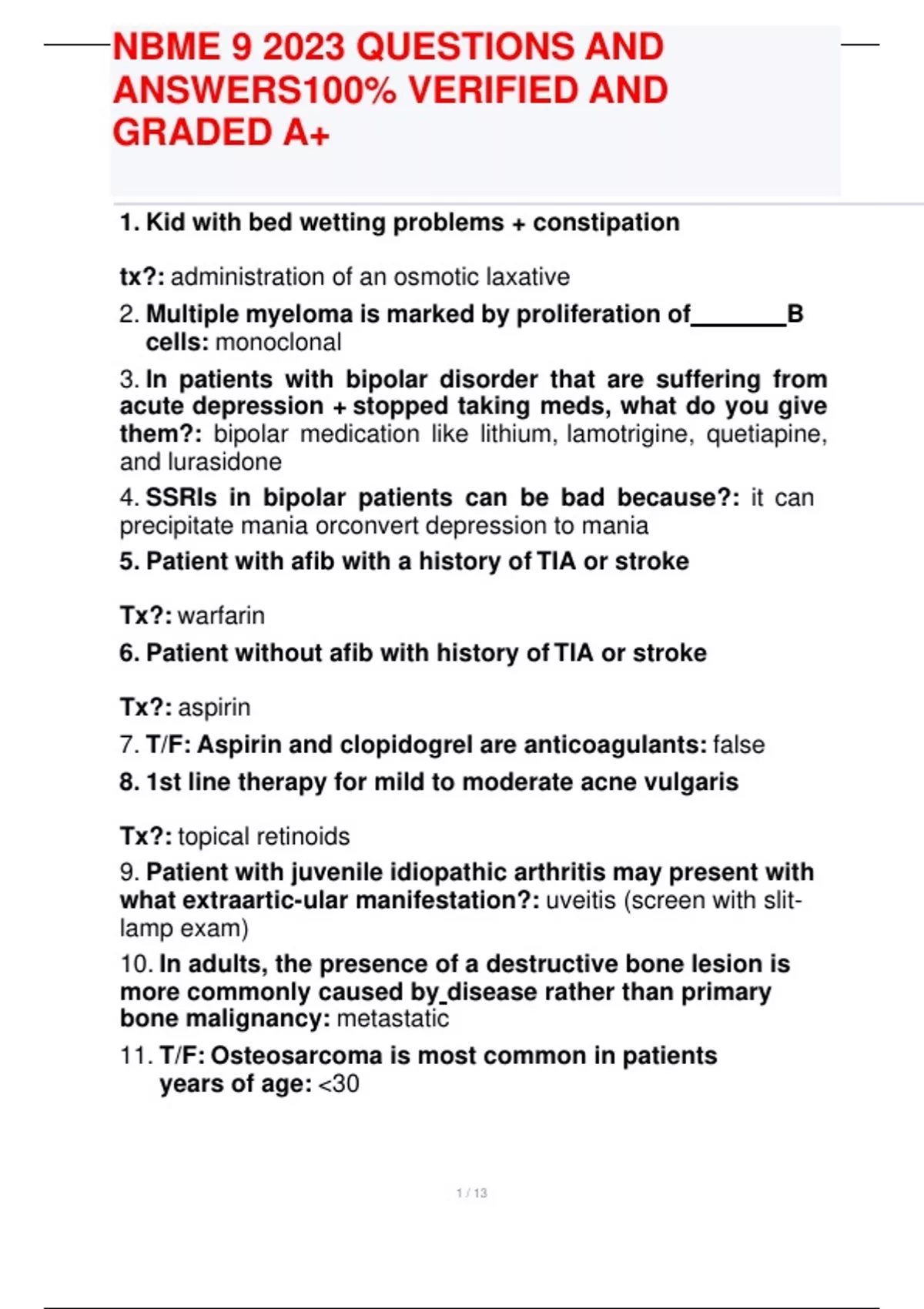 1. Kid with bed wetting problems + constipation tx?: administration of an osmotic laxative 2. Multiple myeloma is marked by proliferation of B cells: monoclonal 3. In patients with bipolar disorder that are suffering from acute depression + stopped taking meds, what do you give them?: bipolar medication like lithium, lamotrigine, quetiapine, and lurasidone 4. SSRIs in bipolar patients can be bad because?: it can precipitate mania orconvert depression to mania 5. Patient with afib with a history of TIA or stroke Tx?: warfarin 6. Patient without afib with history of TIA or stroke Tx?: aspirin 7. T/F: Aspirin and clopidogrel are anticoagulants: false 8. 1st line therapy for mild to moderate acne vulgaris Tx?: topical retinoids 9. Patient with juvenile idiopathic arthritis may present with what extraartic-ular manifestation?: uveitis (screen with slitlamp exam) 10. In adults, the presence of a destructive bone lesion is more commonly caused by disease rather than primary bone malignancy: metastatic 11. T/F: Osteosarcoma is most common in patients years of age: <30