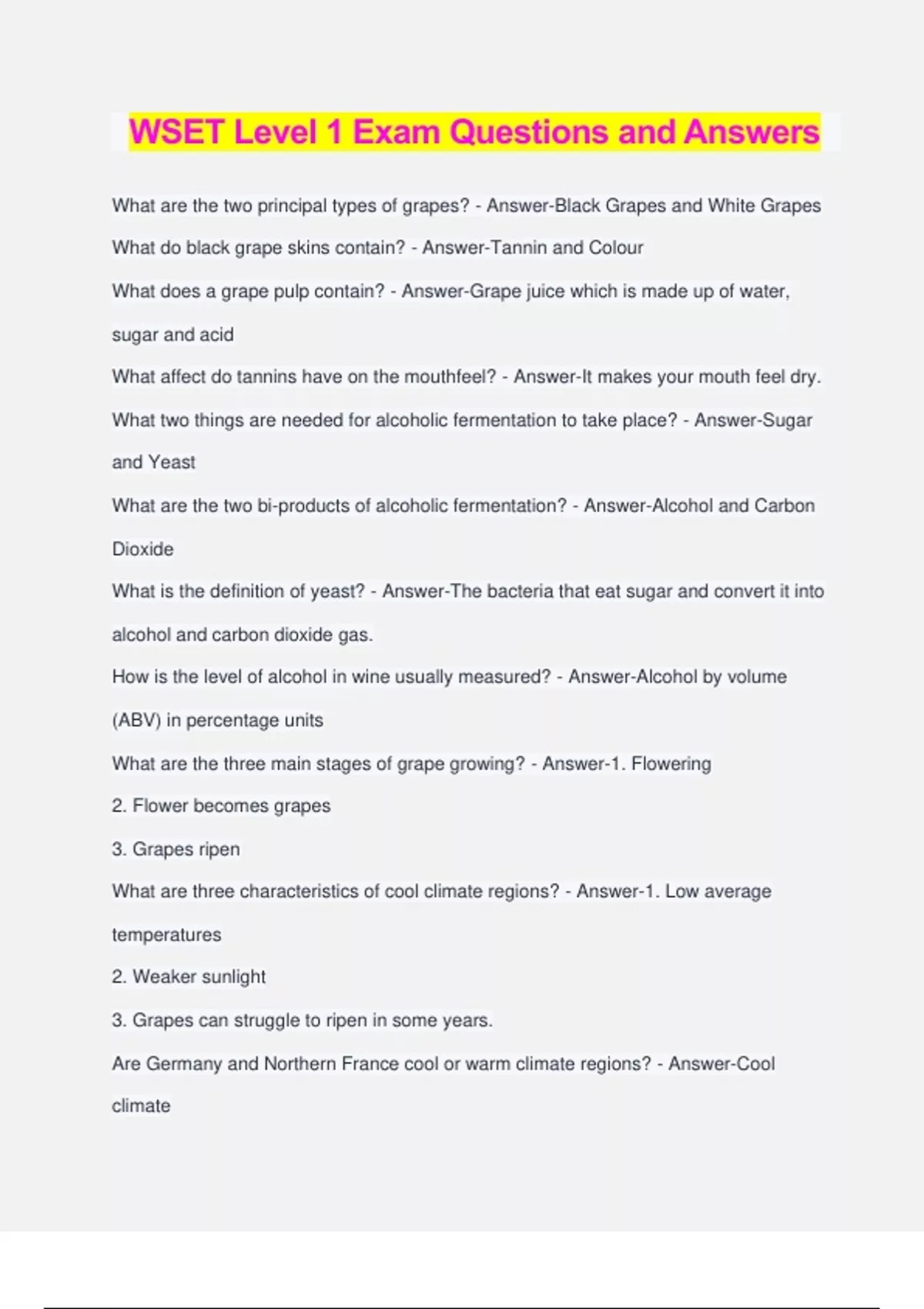 WSET Level 1 Exam Questions and Answers What are the two principal types of grapes? - Answer-Black Grapes and White Grapes What do black grape skins contain? - Answer-Tannin and Colour What does a grape pulp contain? - Answer-Grape juice which is made up of water, sugar and acid What affect do tannins have on the mouthfeel? - Answer-It makes your mouth feel dry. What two things are needed for alcoholic fermentation to take place? - Answer-Sugar and Yeast What are the two bi-products of alcoholic fermentation? - Answer-Alcohol and Carbon Dioxide What is the definition of yeast? - Answer-The bacteria that eat sugar and convert it into alcohol and carbon dioxide gas. How is the level of alcohol in wine usually measured? - Answer-Alcohol by volume (ABV) in percentage units What are the three main stages of grape growing? - Answer-1. Flowering 2. Flower becomes grapes 3. Grapes ripen What are three characteristics of cool climate regions? - Answer-1. Low average temperatures 2. Weaker sunlight 3. Grapes can struggle to ripen in some years. Are Germany and Northern France cool or warm climate regions? - Answer-Cool climate