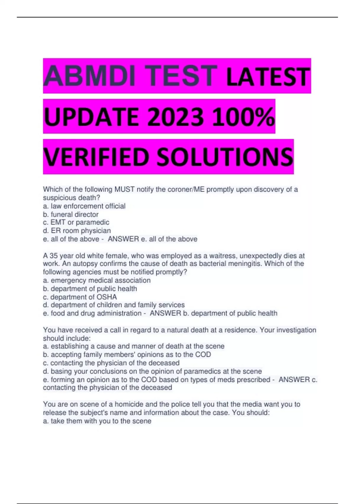 ABMDI TEST LATEST UPDATE 2024 100% VERIFIED SOLUTIONS Which of the following MUST notify the coroner/ME promptly upon discovery of a suspicious death? a. law enforcement official b. funeral director c. EMT or paramedic d. ER room physician e. all of the above - ANSWER e. all of the above A 35 year old white female, who was employed as a waitress, unexpectedly dies at work. An autopsy confirms the cause of death as bacterial meningitis. Which of the following agencies must be notified promptly? a. emergency medical association b. department of public health c. department of OSHA d. department of children and family services e. food and drug administration - ANSWER b. department of public health You have received a call in regard to a natural death at a residence. Your investigation should include: a. establishing a cause and manner of death at the scene b. accepting family members' opinions as to the COD c. contacting the physician of the deceased d. basing your conclusions on the opinion of paramedics at the scene e. forming an opinion as to the COD based on types of meds prescribed - ANSWER c. contacting the physician of the deceased You are on scene of a homicide and the police tell you that the media want you to release the subject's name and information about the case. You should: a. take them with you to the scene b. follow office policy and procedures that your office has established for dealing with media c. tell the media that you will not give them any information but that you will let them take pictures of the body d. let the police make the press release on behalf of your office e. give the media the basic information - ANSWER b. follow office policy and procedures that your office has established for dealing with media In general, which of the following is not normally considered for organ/tissue procurement purposes? a. heart valves b. long bones and pelvis c. kidneys d. tendon and veins e. reproductive organs - ANSWER e. reproductive organs The pathologist must be alerted to religious requests from the family: a. before the victim's body is taken from hospital b. after the autopsy before the body is taken to the funeral home c. before the victim's body is taken from the scene d. only if the religion requires it e. before the autopsy is performed - ANSWER e. before the autopsy is performed Retort - ANSWER a vessel or chamber in which substances are decomposed by heat To establish a working relationship with law enforcement personnel at the death scene, you should: a. discuss case facts with the officer in charge and proceed appropriately b. present the statutory citations for your authority to the officer in charge c. introduce yourself; talk briefly about your responsibilities and listen to theirs d. wait until your supervisor takes you around and introduces you e. keep to yourself until you know the facts of the case - ANSWER c. introduce yourself; talk briefly about your responsibilities and listen to theirs When investigating a death, it is best to: a. use all available resources b. get all scene investigative information from LE c. work alone d. disregard how problems affect personnel e. not listen to other or ask questions - ANSWER a. use all available resources List the key attributes of nonverbal communication - ANSWER Eye movement, physical gestures, and facial expressions Jurisdiction - ANSWER the power or authority a court or office has over individuals or trauma Authorization for organ/tissue procurement is considered vali